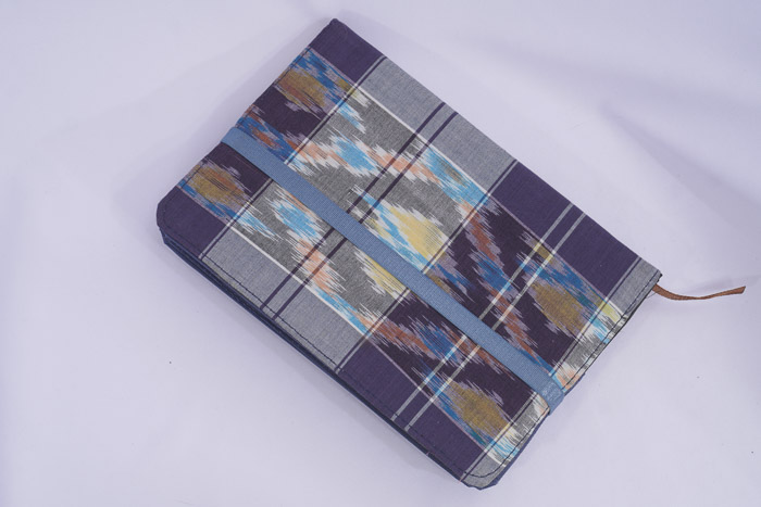 We created this agenda book from scratch. We assembled fabric onto paper and then stitched it together. It also includes a pencil case that functions as the book's closure.