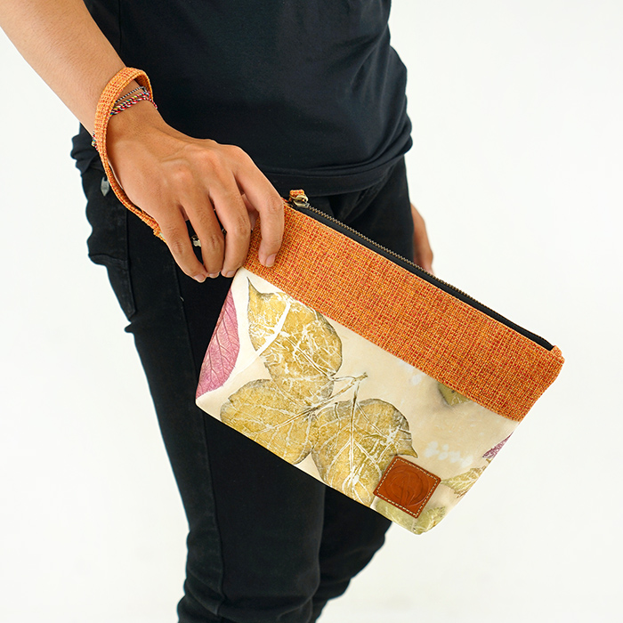 Pouch Ecoprint made of premium jute denim/silk mix fabric. Its products print natural motifs (leaves, flowers and natural dyes) called eco prints. The work is done on fabric, using this product is expected to support green life by reducing synthetic dyes that produce harmful pollutants to our earth. However, you can still look fashionable by using this product while protecting the earth.