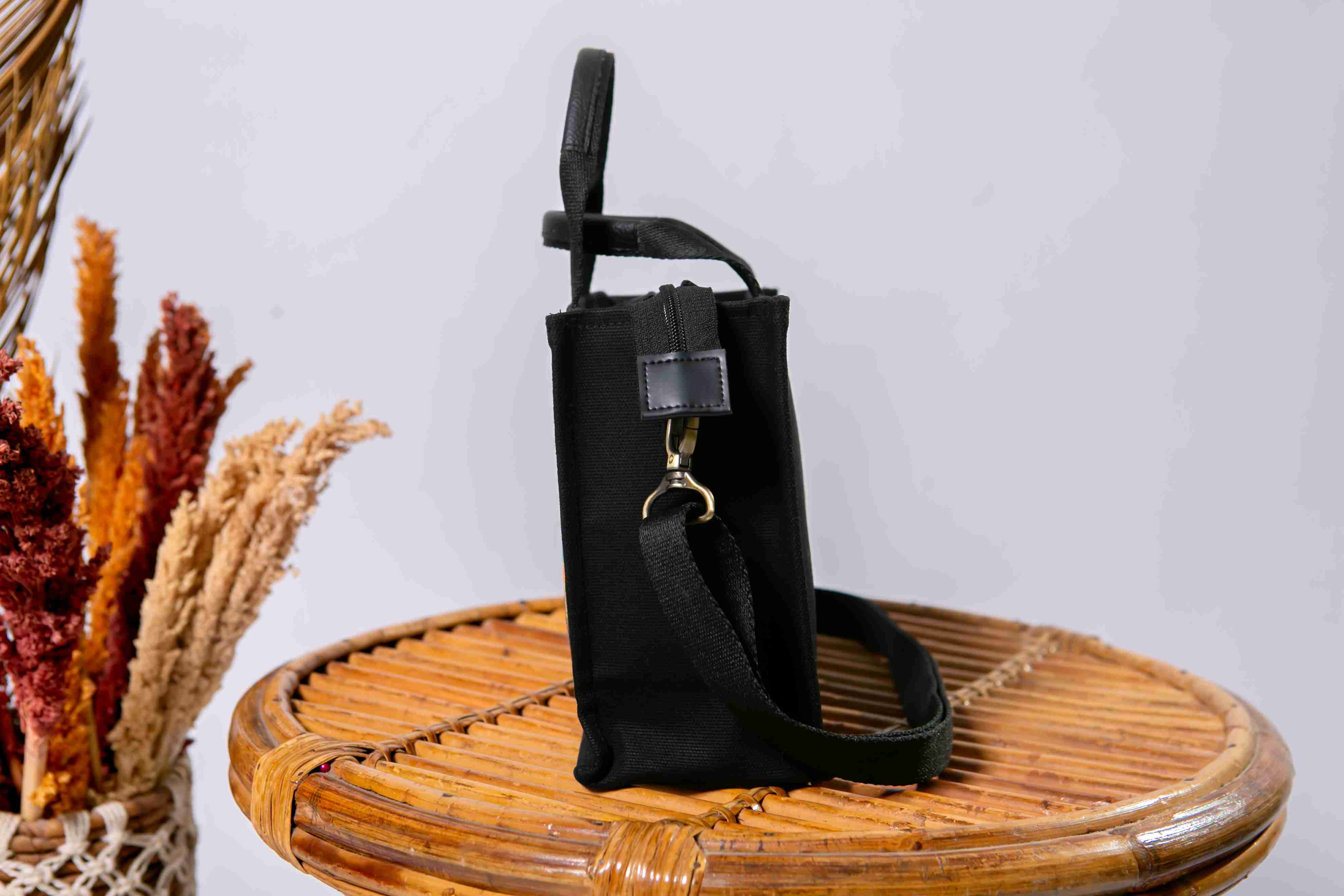This bag radiates ethnic elegance with its vibrant “tumpar” embroidery featured on the front panel. Made from high-quality black canvas, it offers both striking style and lasting durability.