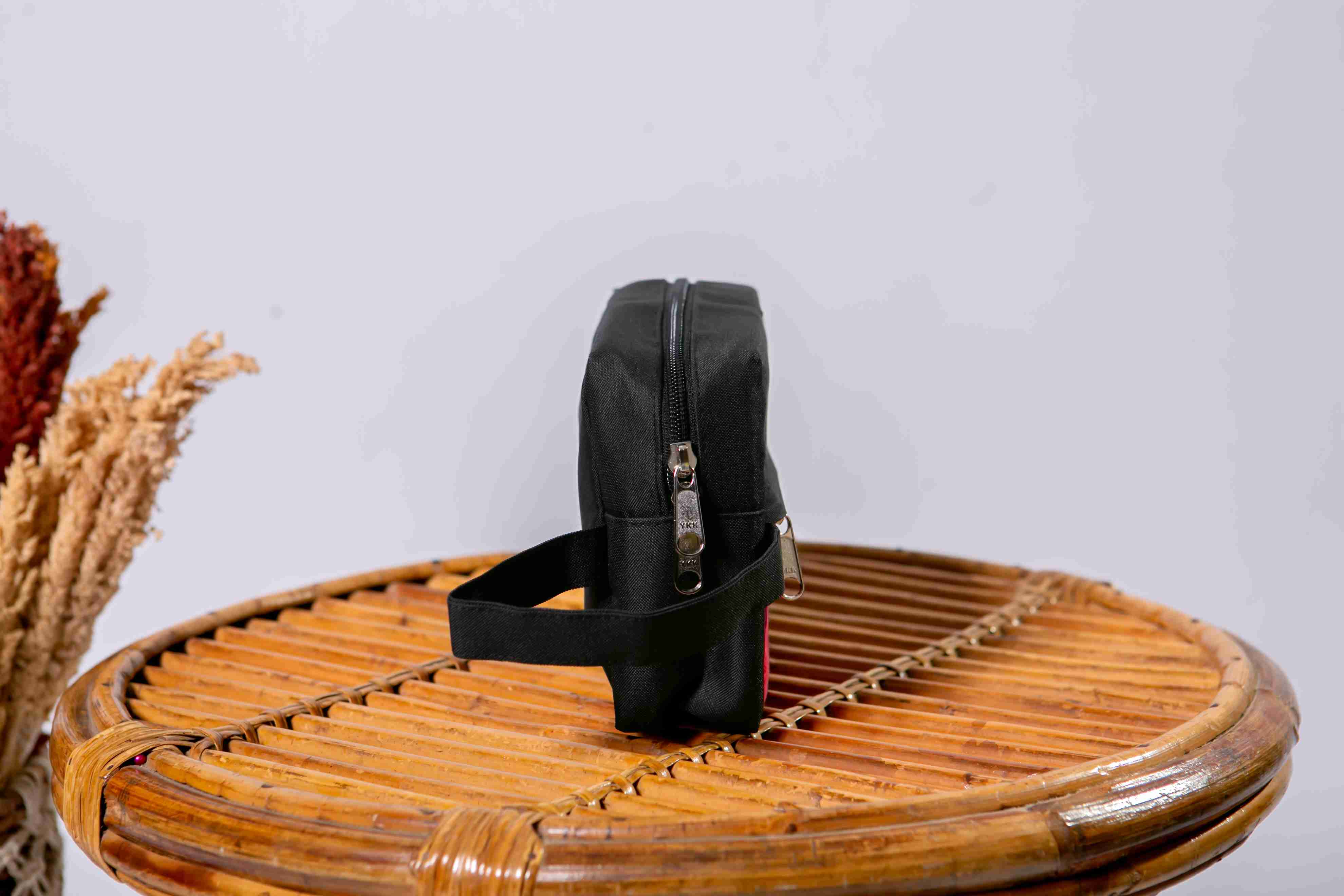 This batik pouch offers a modern yet practical design, made from a durable black canvas fabric paired with a stylish ethnic batik pattern on the front. It features a main zipper closure and an additional front zippered compartment, making it ideal for storing personal items like stationery, cosmetics, or travel essentials. Designed with a side handle for easy carrying, this pouch is perfect for everyday use or as a unique cultural souvenir from Indonesia.