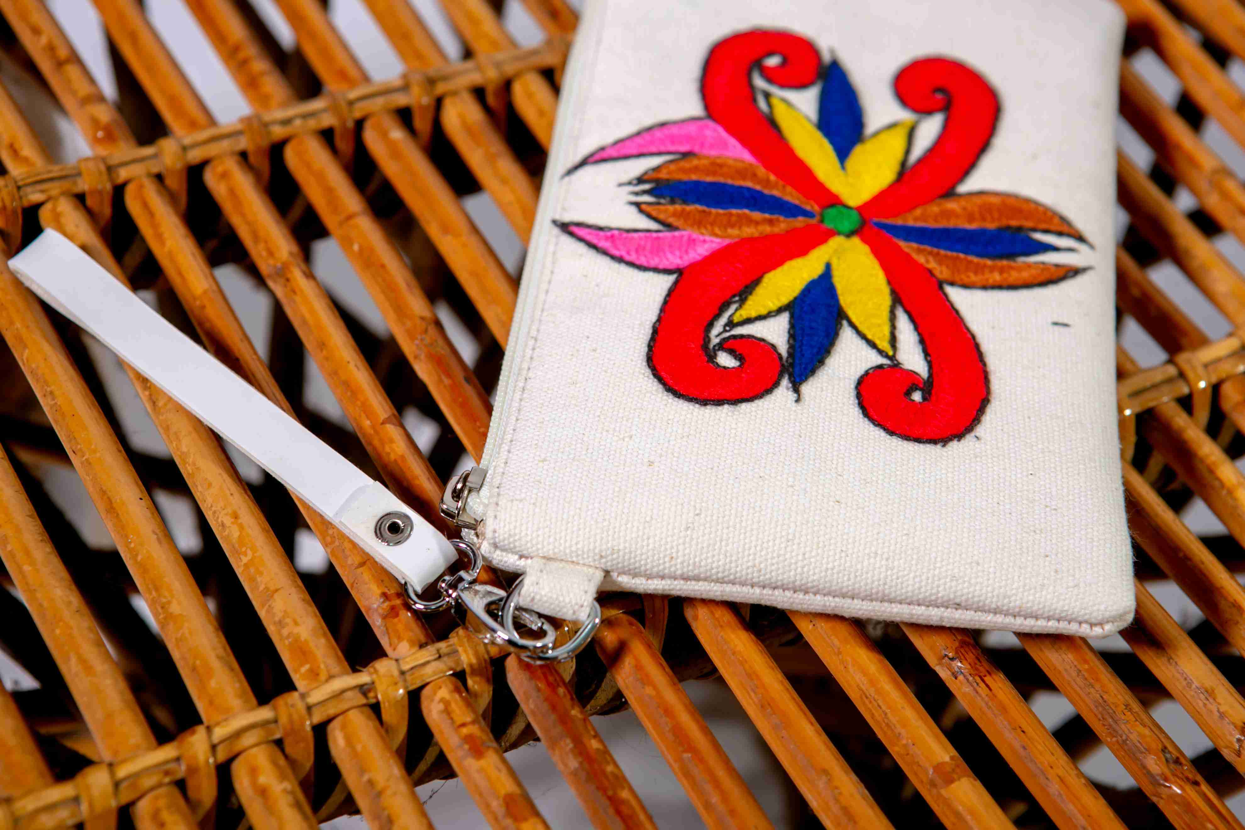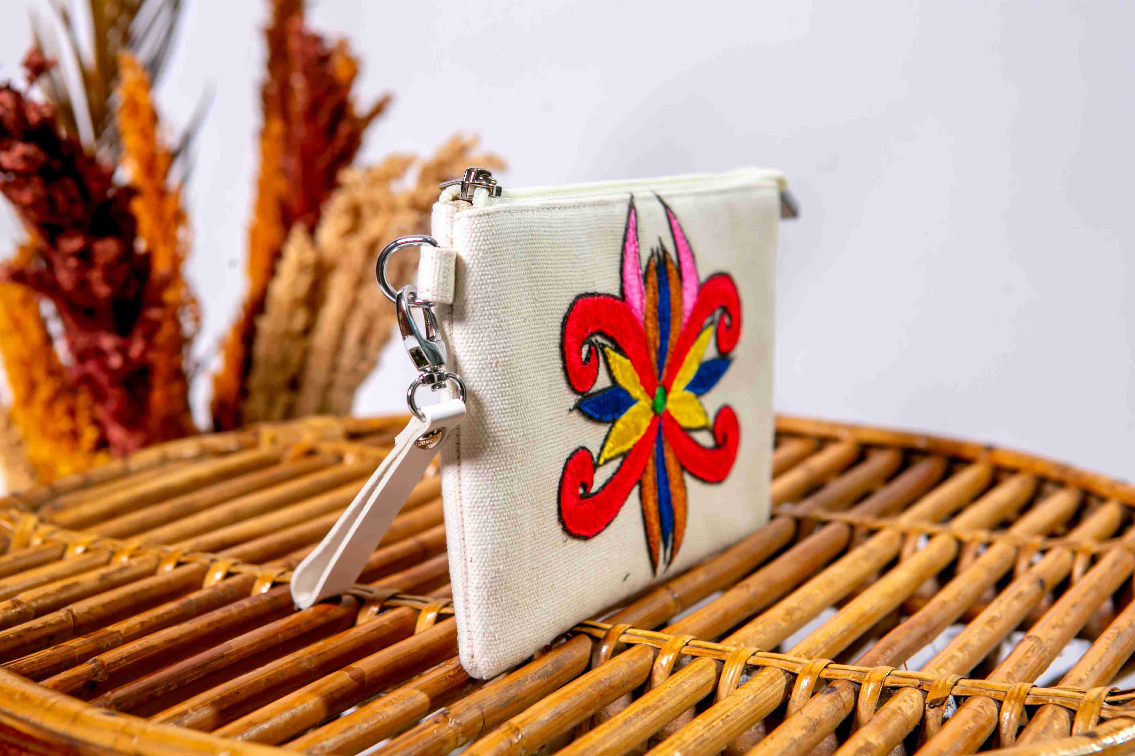 This simple yet ethnic pouch is made from natural-colored canvas fabric, known for its durability and eco-friendly qualities. It features a vibrant "tumpar" embroidery, a traditional Kalimantan motif that highlights rich local culture. Equipped with a top zipper closure to keep your items secure and a small wrist strap for easy carrying. Perfect as a coin purse, accessory holder, or a multi-purpose pouch to keep in your bag. Its compact and practical design makes it an ideal choice for everyday use or as a unique Indonesian souvenir.