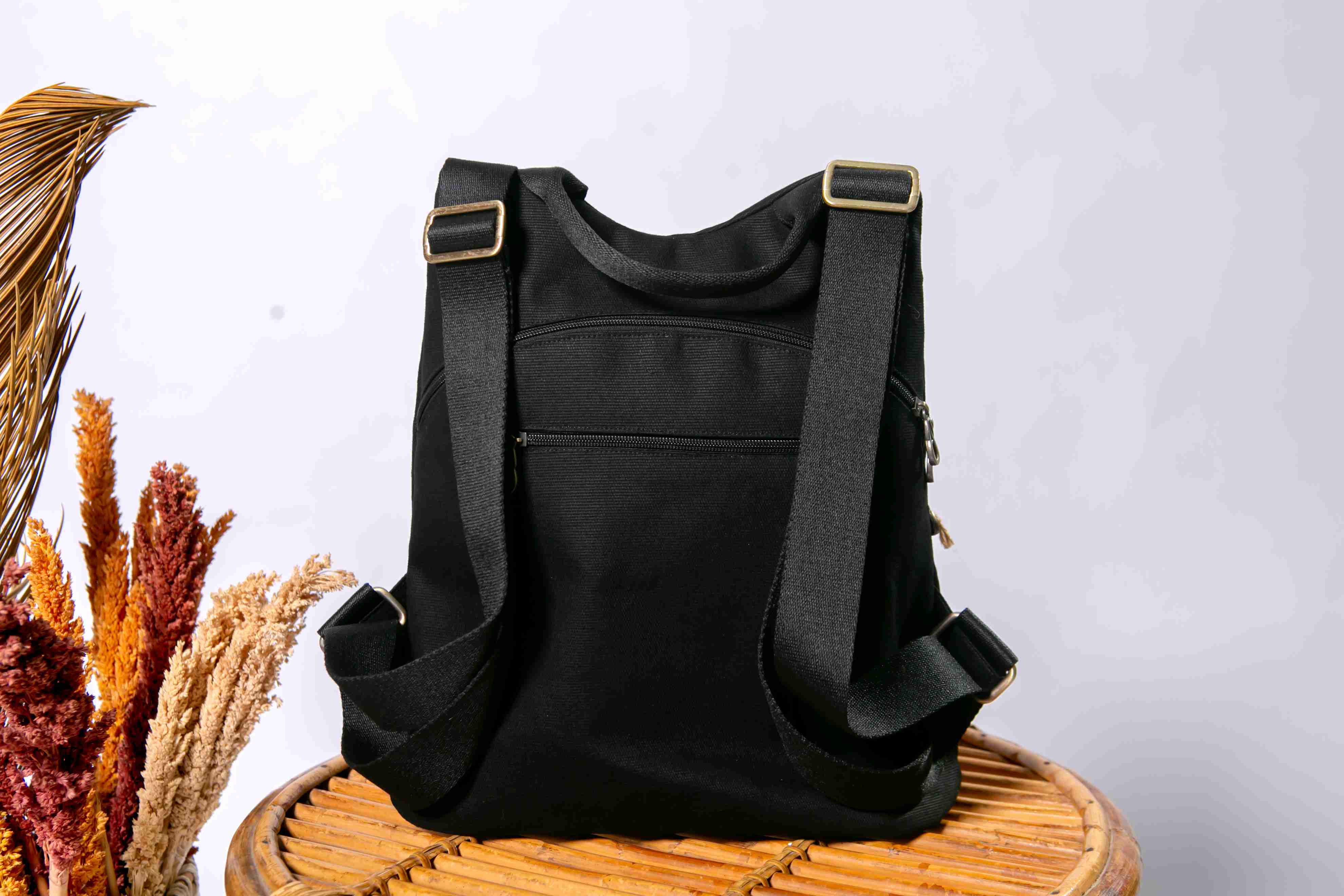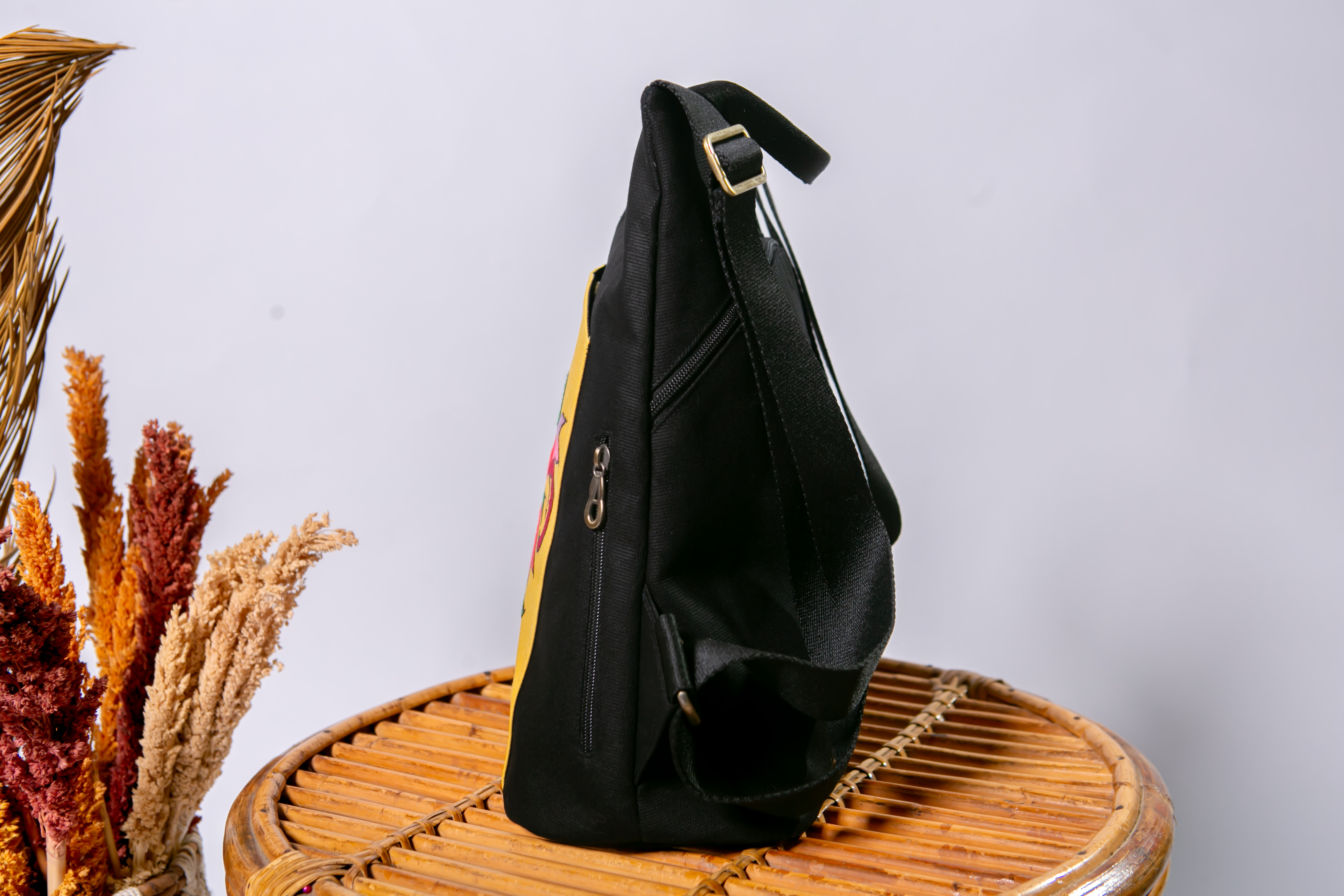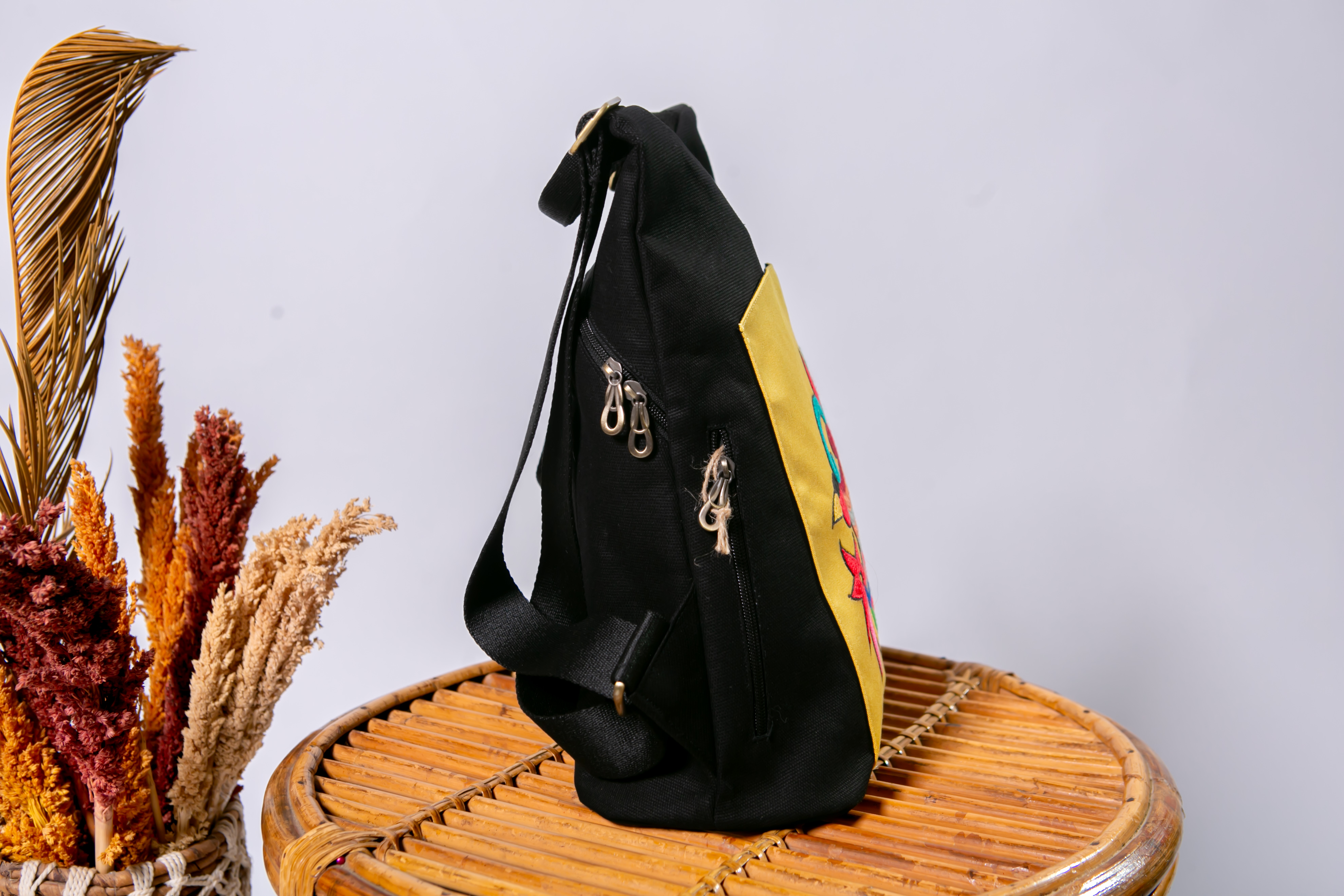 Black canvas backpack featuring vibrant ethnic bird embroidery on the front panel. Side zippers and adjustable straps make it perfect for daily use with a touch of local heritage.