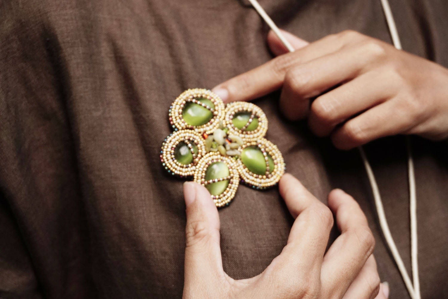 "Sekar", terinspirasi dari bentuk bunga dengan 5 kelopak. Bentuk tersebut melambangkan keindahan dan kecantikan sehingga orang yang melihat akan terpesona. Dibuat oleh Artisan Joglo Ayu Tenan dengan menggunakan teknik embroidery.