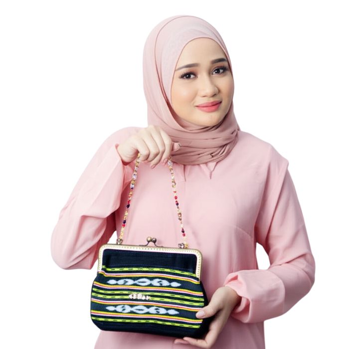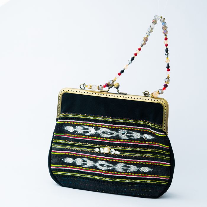 A distinctive vintage silhouette with a metal frame, featuring dark-hued Tanimbar Ikat weaving from Maluku as its base. The clutch's elegance is further enhanced by Dobo Sea Pearls from Maluku's islands, intricately beaded with crystals.