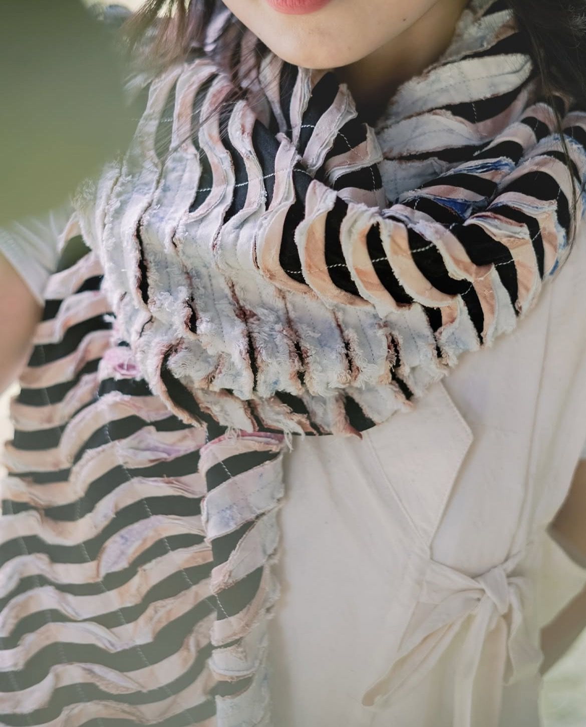 Pattern Meaning: Effortless style in every fold. Our fabric manipulation scarf elevates your everyday look with its rich dimension and soft drape - crafted using our signature fabic manipulation technique from repurposed cut-offs. Back by popular demand, this favorite piece is now restocked and available in a range of beautiful color shades. A look that speaks sotly, but with meaning.