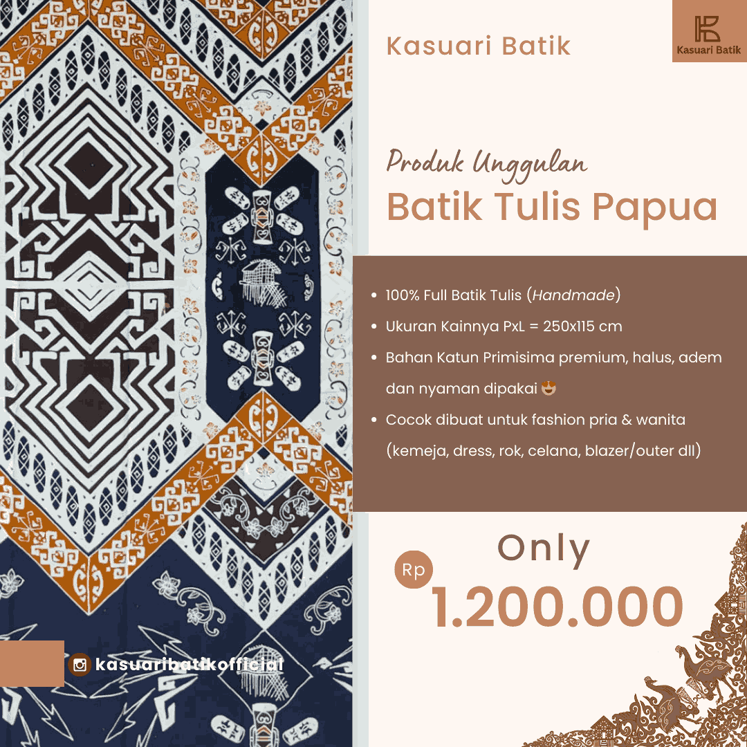 Founded in 2006 in Manokwari - West Papua, Kasuari Batik is one of the leading "Papua Batik & Tenun" fashion design houses and a symbol of exclusive ready-to-wear brand. Our design are produced carefully in traditional way by the hand of our experienced artisans. All of our products crafted with great attention to detail. Born from an inspiration that is coming from the culture, tradition, diversity of flora and fauna from Eastern Indonesia, Papua & West Papua. It's authentic, artsy and unique.