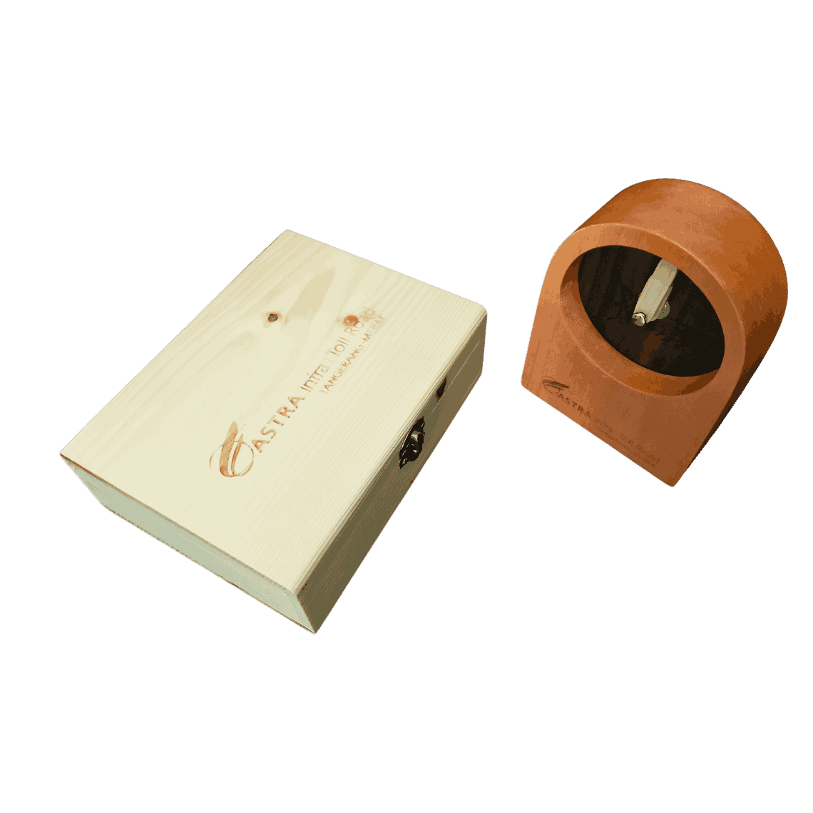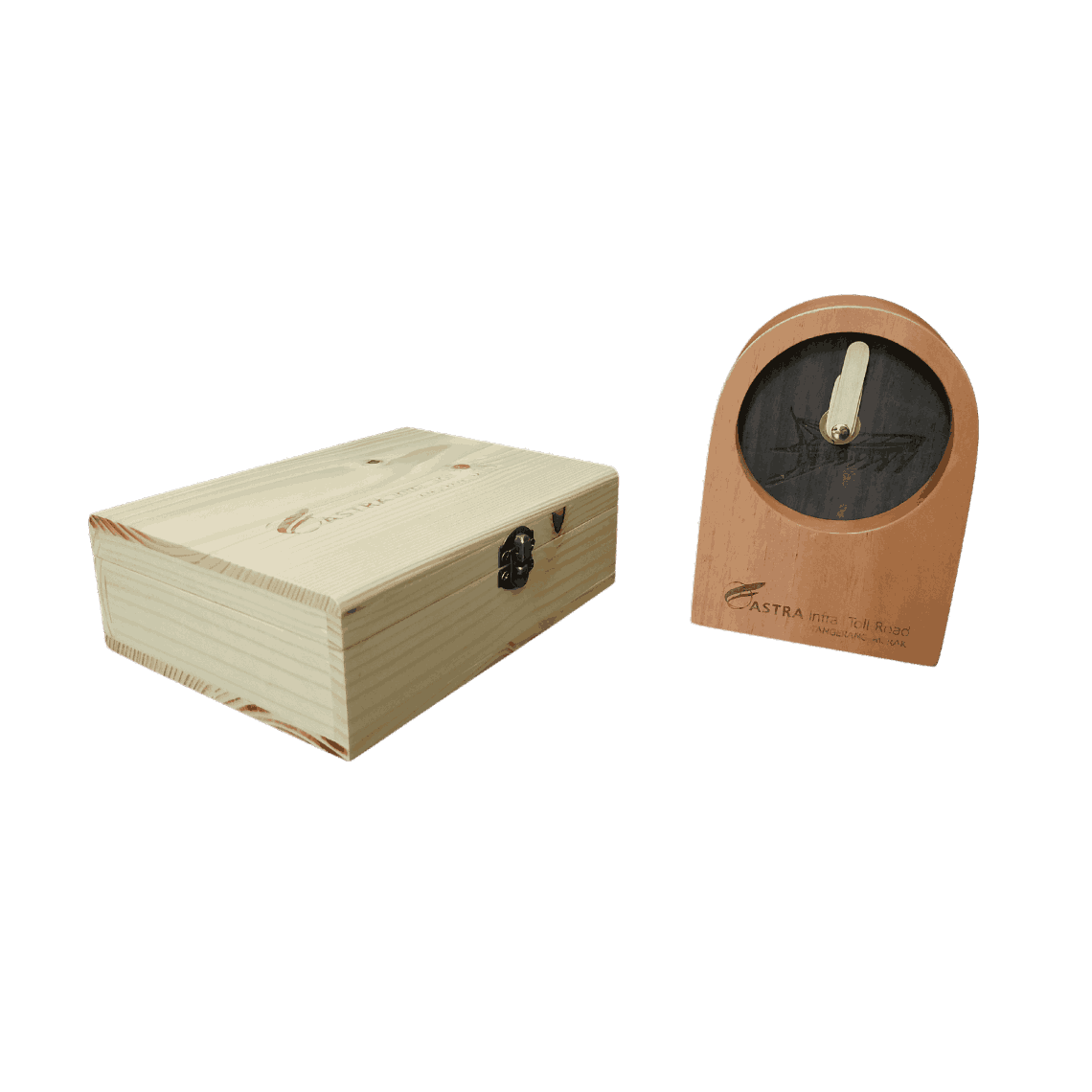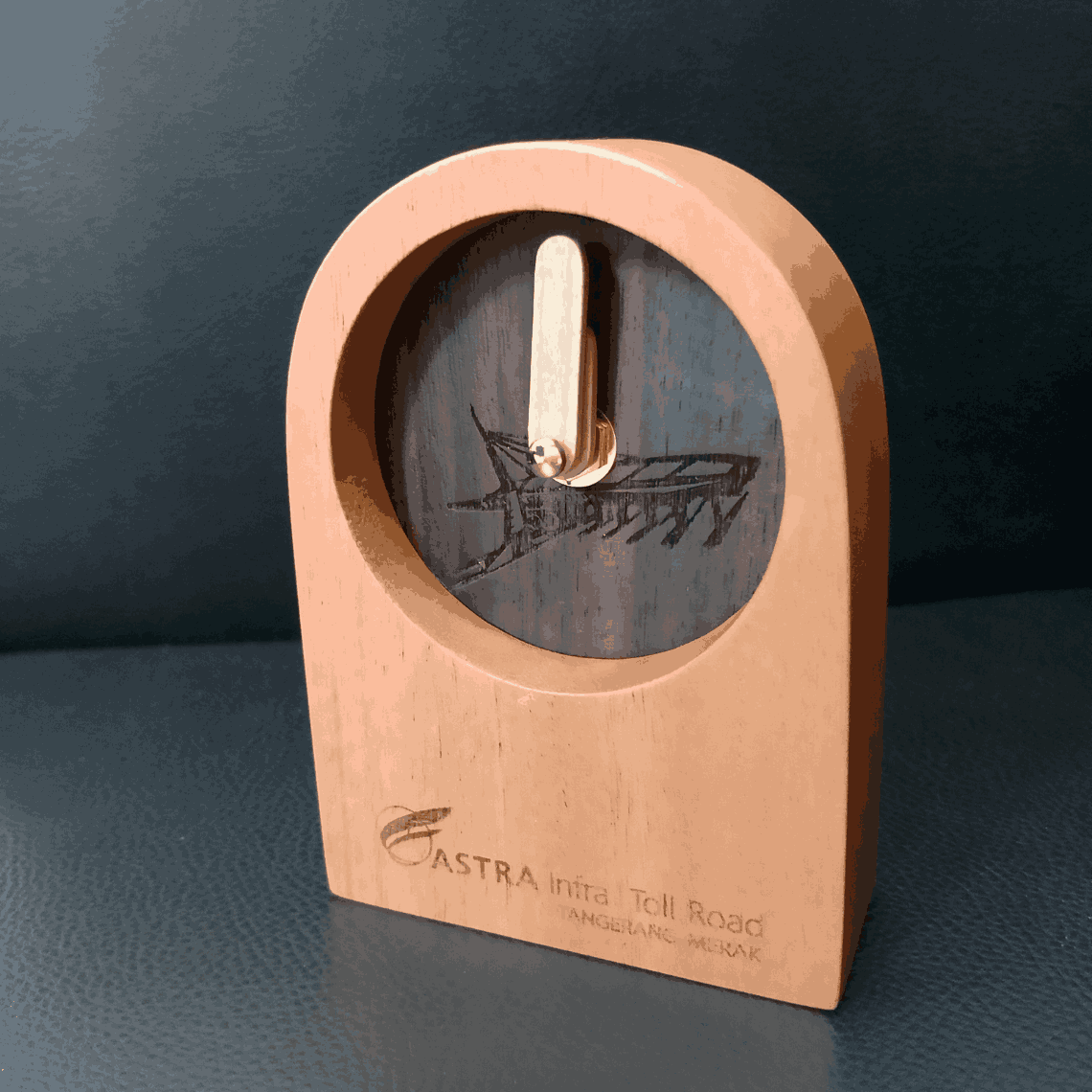 A unique wooden desk clock made from mahogany wood, featuring a hand movement crafted from maple wood, and packaged in a pine wood box made from factory pallet waste. The Aruni desk clock can be customized with corporate logos, making it ideal for souvenirs and gifts.