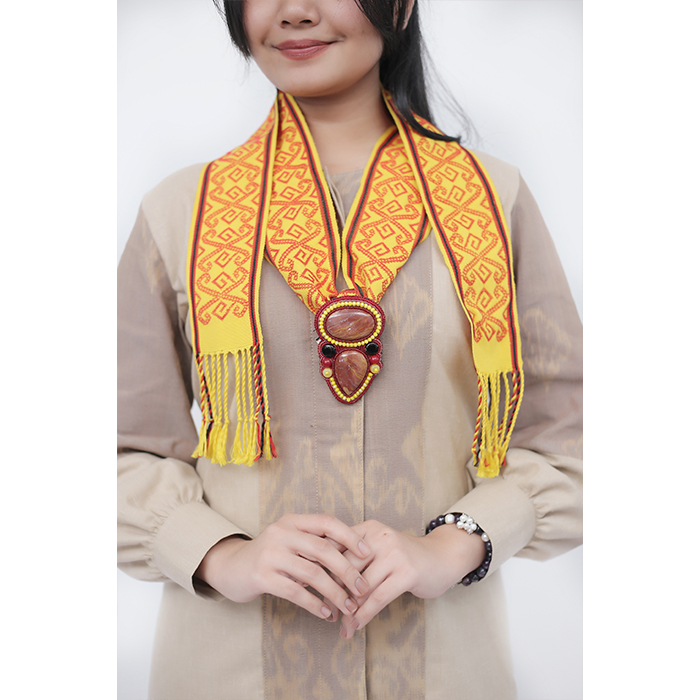 Material Type: Sidan Kapuas Hulu woven scarf, Jesper natural stone, round natural stone, mote, crystal, sequin, thick synthetic leather backing, safety pin and synthetic leather necklace chain.