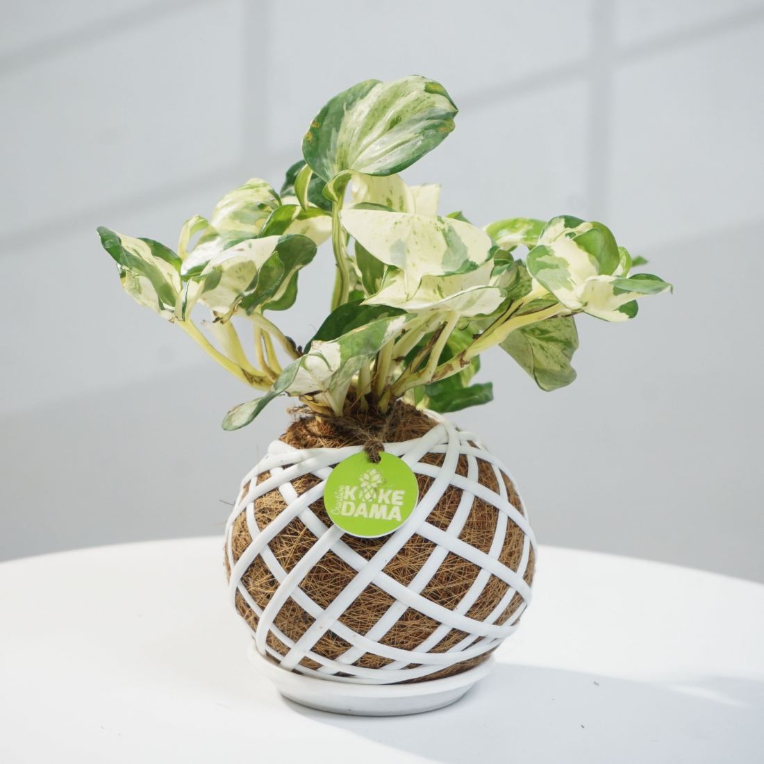 Manjula Pothos (Epipremnum aureum 'Manjula') is admired for its uniquely patterned leaves—creamy white, light green, and dark green blended in unpredictable, stunning swirls. Wrapped in a handcrafted kokedama of coconut fiber, this plant delivers a soft, artistic touch to any indoor setting.