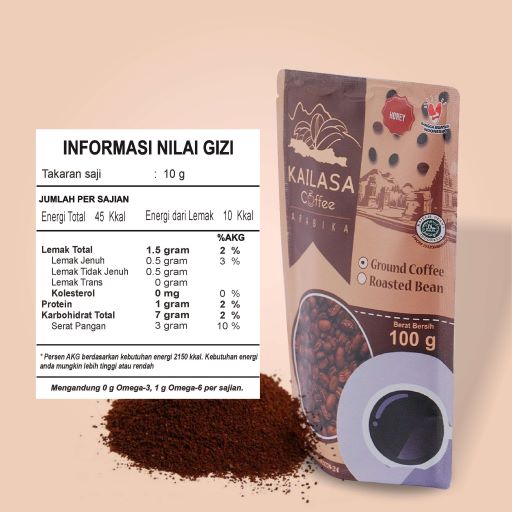 Kailasa coffee is coffee with geographical indications Arabica Coffee Dieng Mountain, Banjarnegara. Planted at an altitude of 1,200 Mdpl with a majority of varieties Lini S 795. Planting sites are located on the mountainside of the Bismo Hill, which includes the highland area of the Dieng. Processed with a variety of proper coffee beans processing, It has a distinctive scent, with a good taste, as well as variants in the processing process will create a typical Nusantara coffee. Raw materials cherry red coffee, selected premium bean, specialty coffee, fresh roast, standart profile roasting light to medium, medium to fine standart grinding, 100 % Arabica coffee, pure and natural, guaranteed, PIRT and Halal Certified, listed on DJKI.