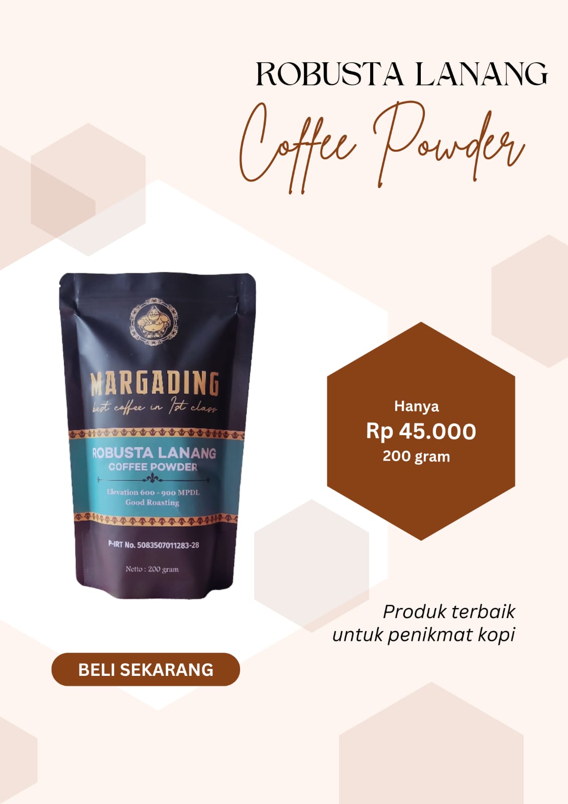 Margading Coffee production began in 2012 at the same time as the mass traditional roasting activity recorded in the Muri Record which was organized by the East Java Agricultural Service in Wonosari Village, Malang Regency. Margading Coffee is a coffee originating from Tirtoyudo District which is characterized by Semeru Lereng Coffee with Premium Robusta, Lanang Robusta and Premium Arabica variants which are currently Best Seller. For Coffee Lovers and Coffee Connoisseurs, don't run out because Margading Coffee is true Javanese Coffee.