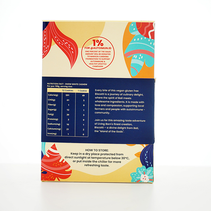 Vegetable cookies, a natural gluten-free healthy snack option that can be consumed by all ages. Made from the best local vegetable sources native to Indonesia, such as high-quality sago flour and cassava flour, thus helping to revive the economy of dedicated farmers and artisans. The natural sweetness of coconut sugar in minimal quantities makes this product safe for consumption for those of you who limit sugar intake. Snow White Cashew Biscotti is enriched with various benefits of cashew nuts, including protein and calcium, unsaturated fats which are needed for the growth of new cells, improving blood fat profiles, supporting skin and joint health, and optimizing the health of the immune system. 1% of the sales value of this product is donated to support public education about autoimmune diseases and the importance of adopting a healthy lifestyle.