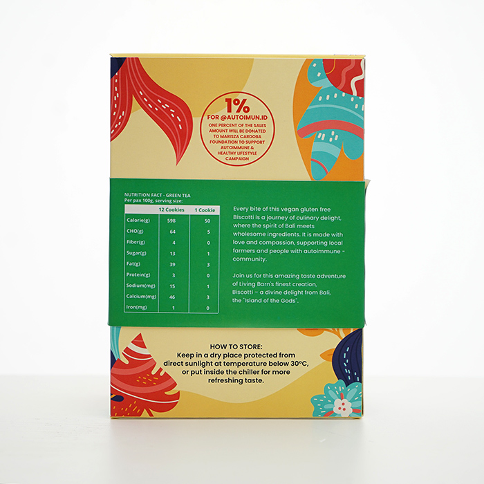 Vegetable cookies, a natural gluten-free healthy snack option that can be consumed by all ages. Made from the best local vegetable sources native to Indonesia, such as high-quality sago flour and cassava flour, thus helping to revive the economy of dedicated farmers and artisans. The natural sweetness of coconut sugar in minimal quantities makes this product safe for consumption for those of you who limit sugar intake. This product is enriched with various goodness of sunflower seeds which contain Vitamins B, E, and Selenium. With green tea content in it, Green Tea Biscotti supports your brain, heart, skin and digestive health. 1% of the sales value of this product is donated to support public education about autoimmune diseases and the importance of adopting a healthy lifestyle.