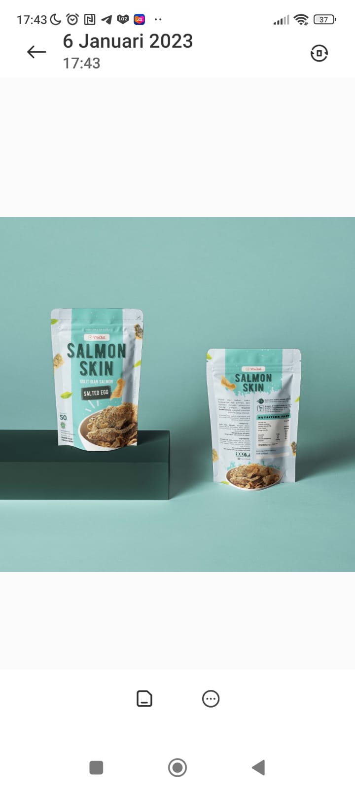 Material Content: Kulit ikan salmon segar, rempah-rempah, bumbu salted egg, daram, penyedap, minyak goreng kelapa sawit