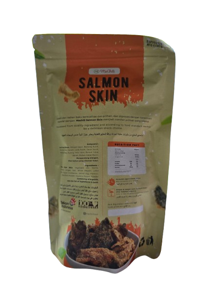 Material Content: Kulit Ikan Salmon segar, rempah-rempah, salted egg, bubuk cabai, garam, penyedap, minyak kelapa sawit