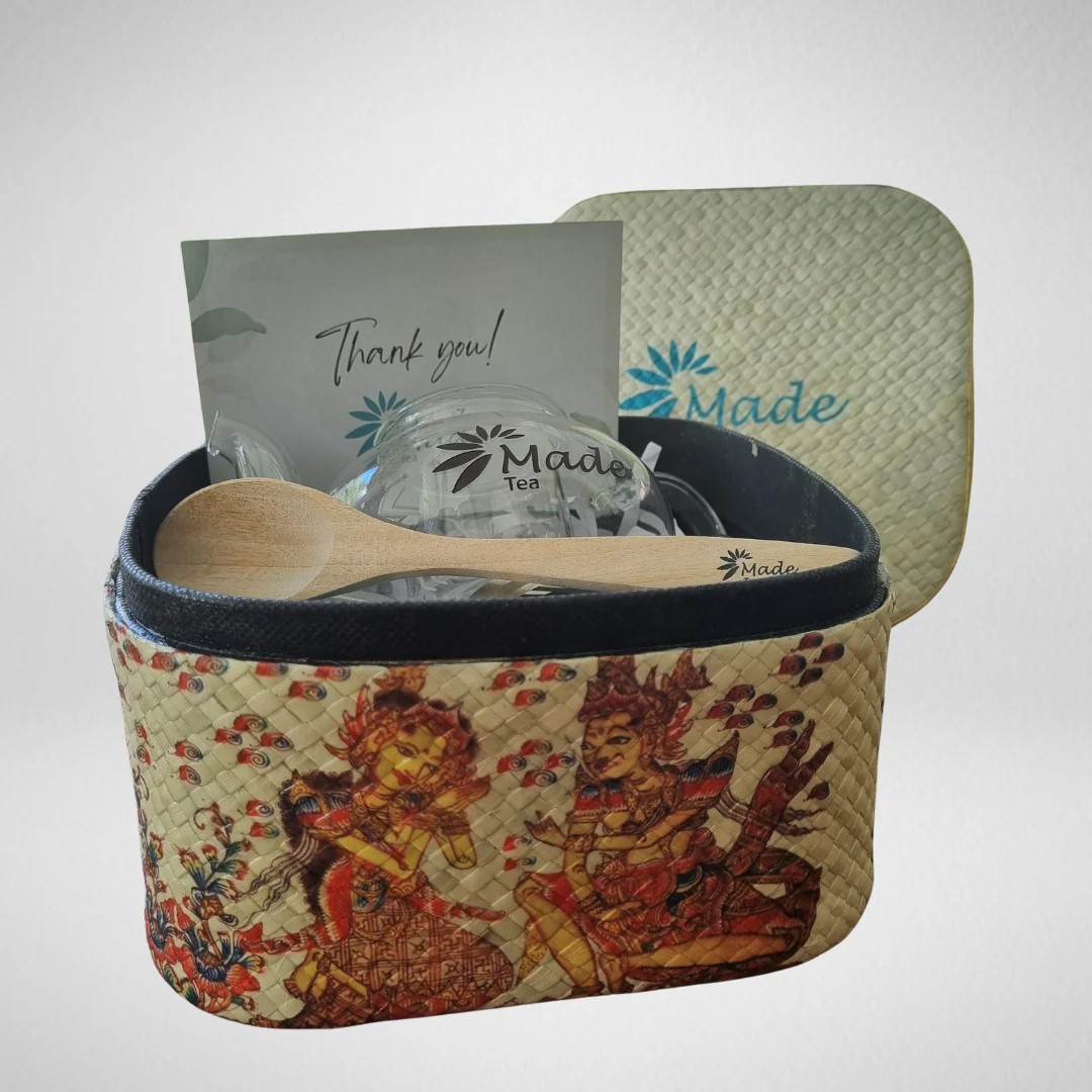 Material Content: Made Tea Glass Teapot (400 ml), 2 Jars of Tea, Wooden Spoon, Thank You Card, Handmade Kamasan Box