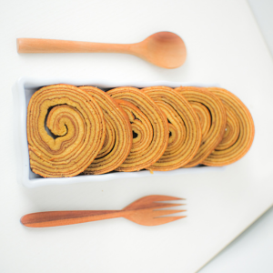 Lapis Legit Gulung is a Makacha innovation from the usual lapis legit, served rolled up creating a new sensation in consuming lapis legit, using the original pekkuk seasoning to make it smell like spices. The typical sweet and savory butter dominates each layer of this cake.