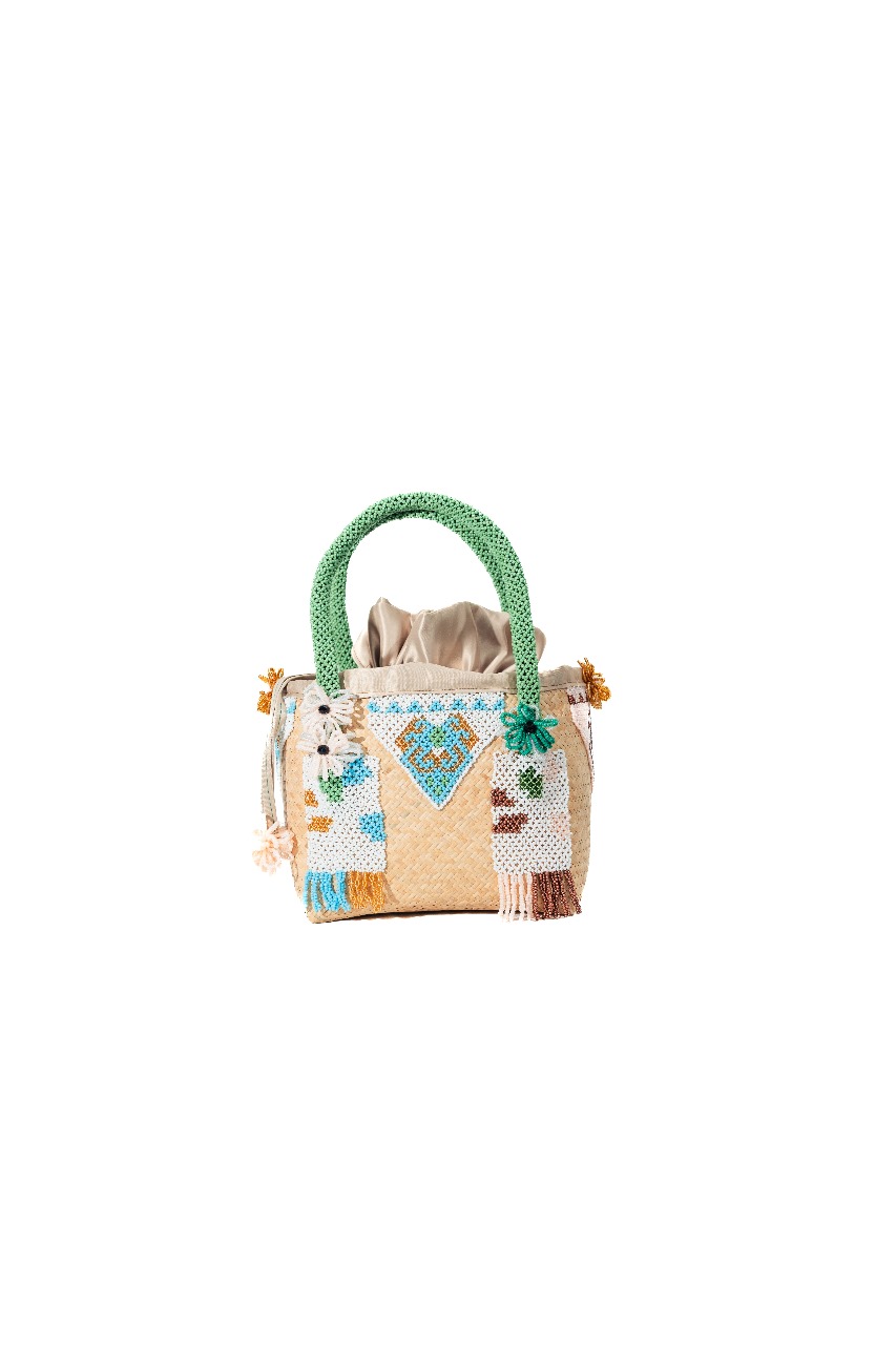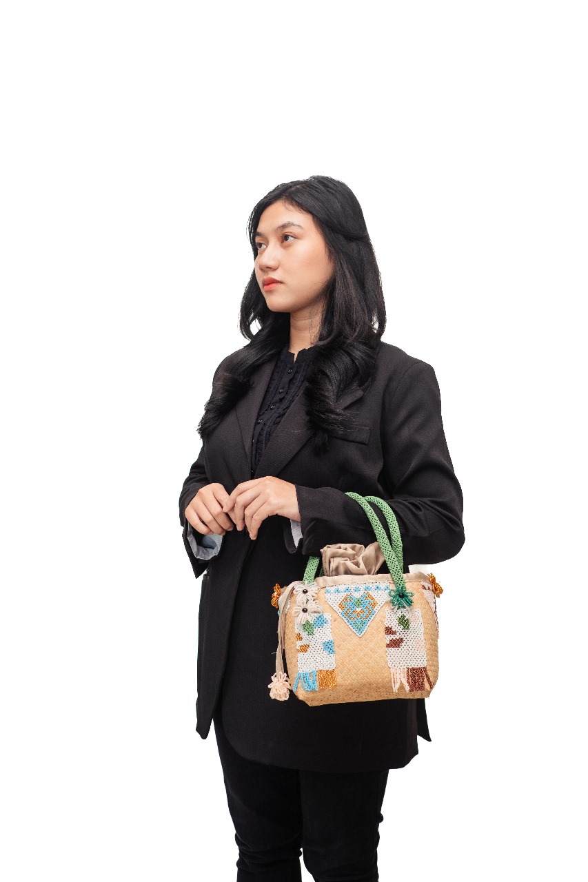 Crafted from woven rattan combined with beadwork, featuring traditional Dayak motifs intertwined with modern color designs.