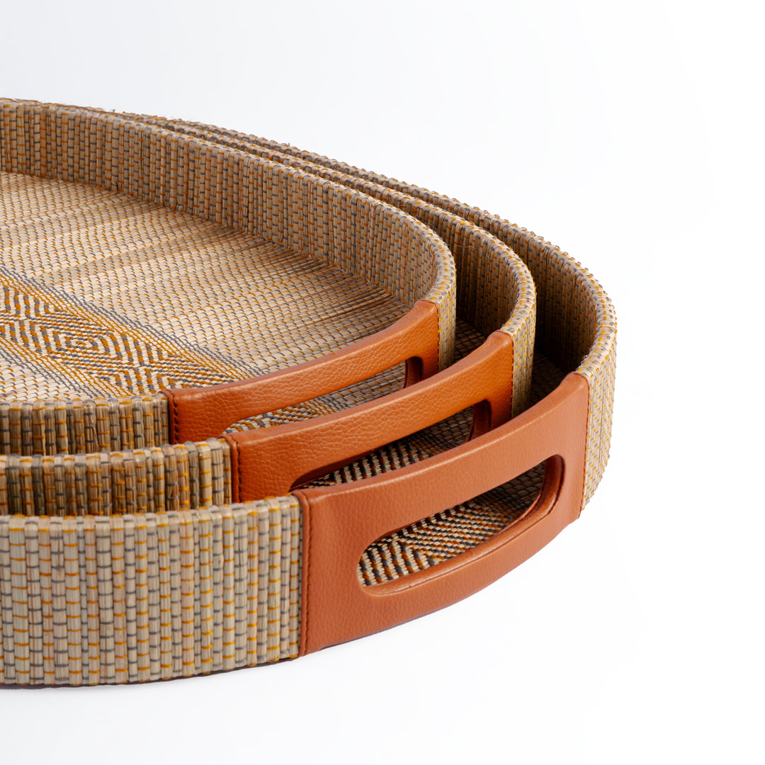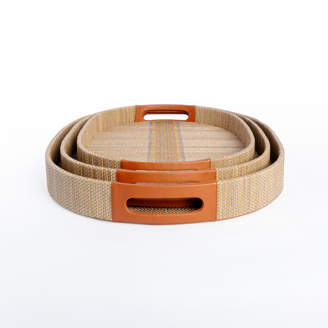 Beautiful oval tray set in 3 sizes, featuring open handles wrapped in high-quality PU leather for a comfortable grip. This set combines the structural strength of greyboard and blockboard with the natural look of woven mendong. The base and handles are coated with PU leather, adding a luxurious touch and durability. Perfect for serving drinks, decorating tables, or as a modern ethnic interior element.