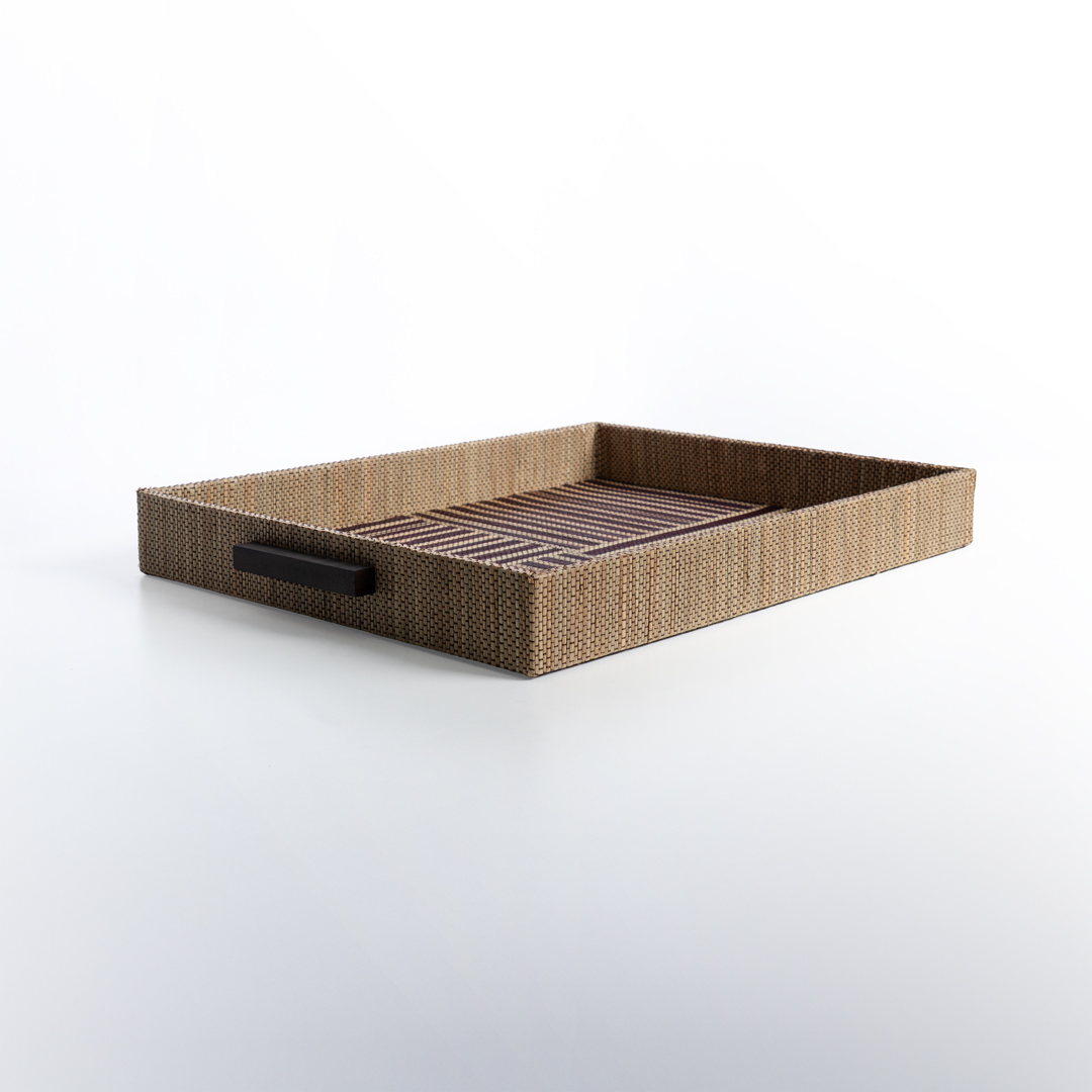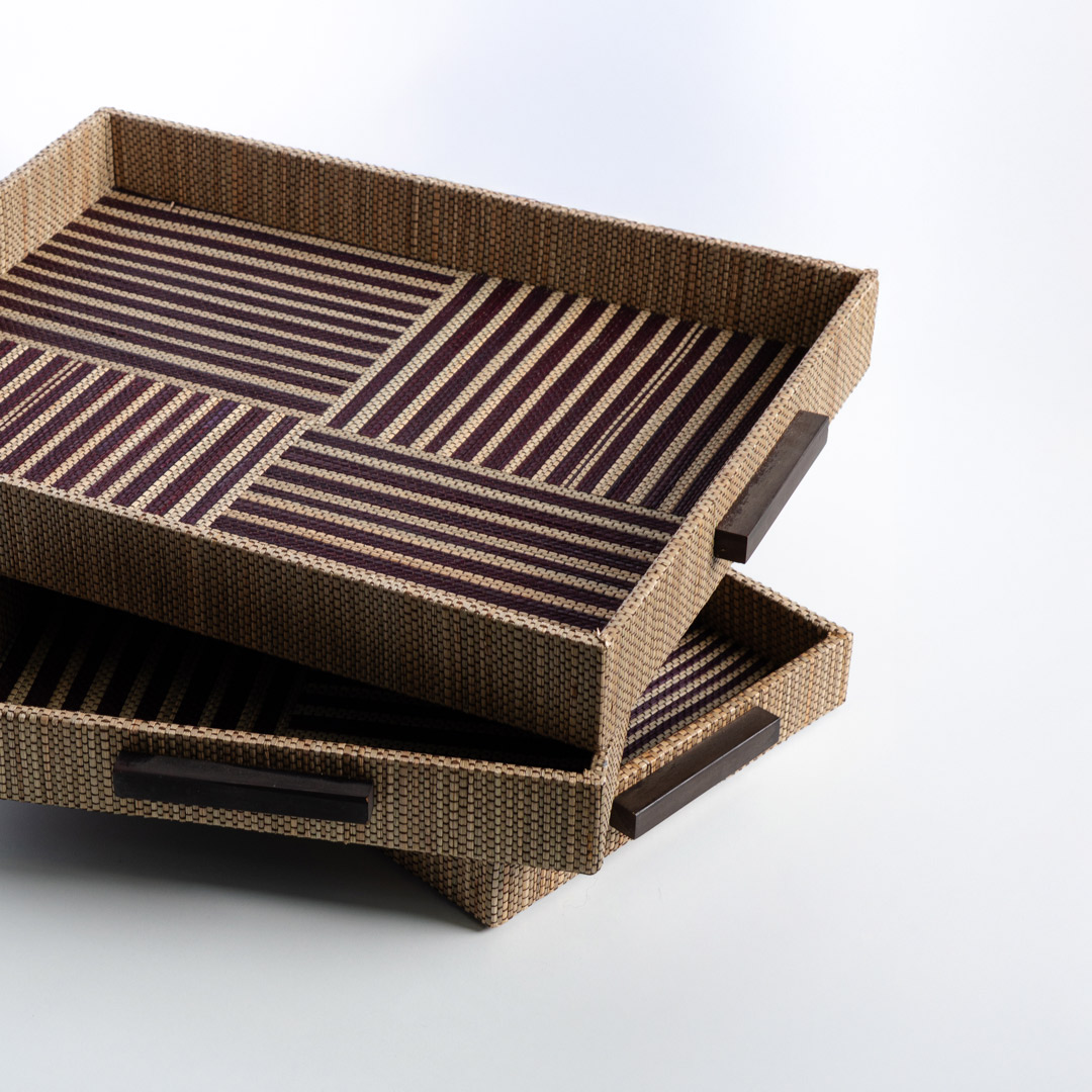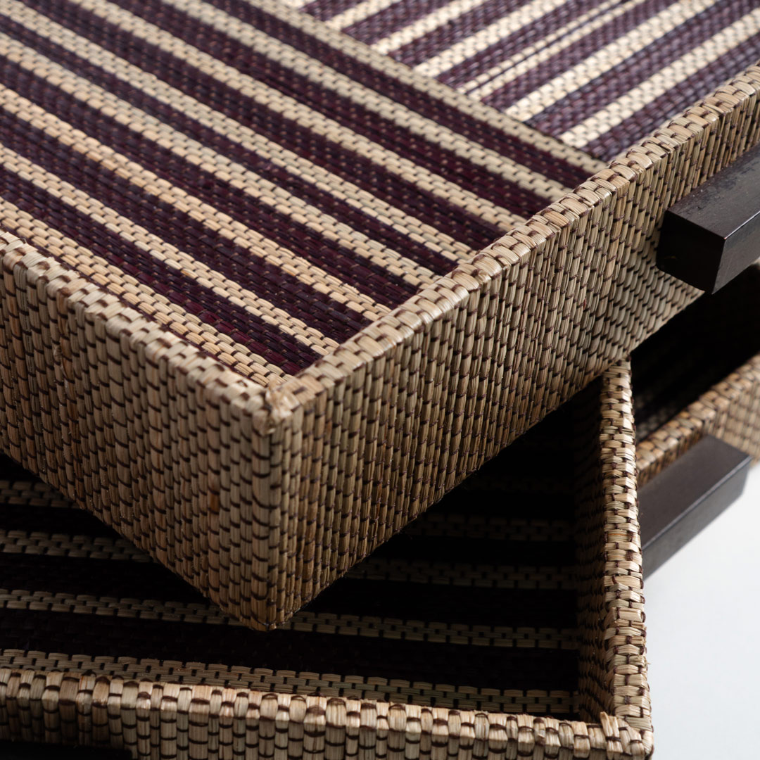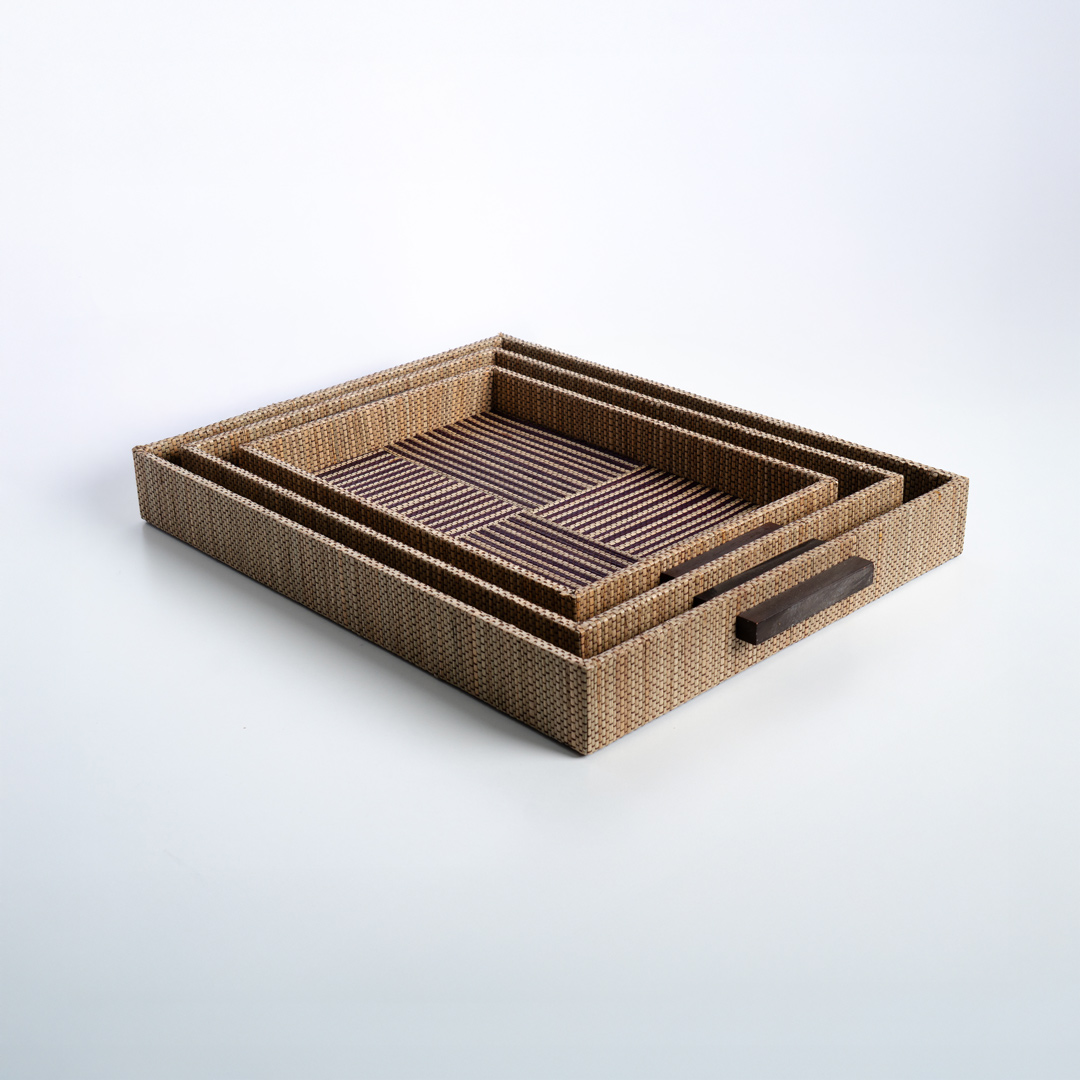 Rectangule tray set (3 pieces) with a sturdy MDF structure and striped woven mendong wrapping, exuding warm classic beauty. Its simple yet elegant design makes it a perfect choice for serving, table decoration, or as a complement to modern ethnic interior elements. Suitable for use in homes, cafes, or hotels that promote natural and local cultural themes.