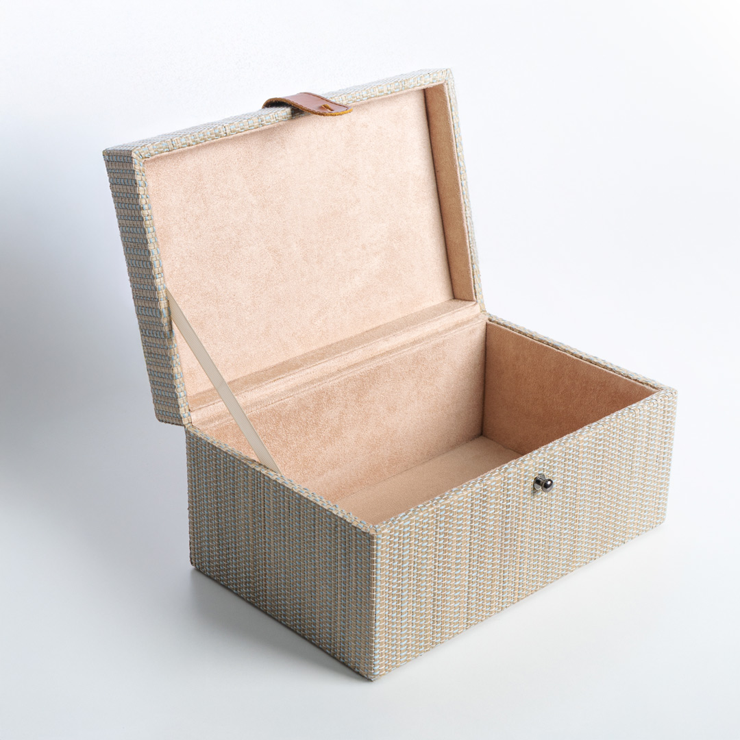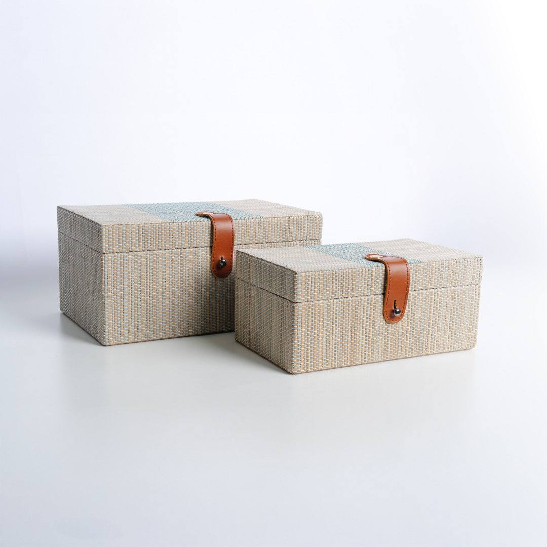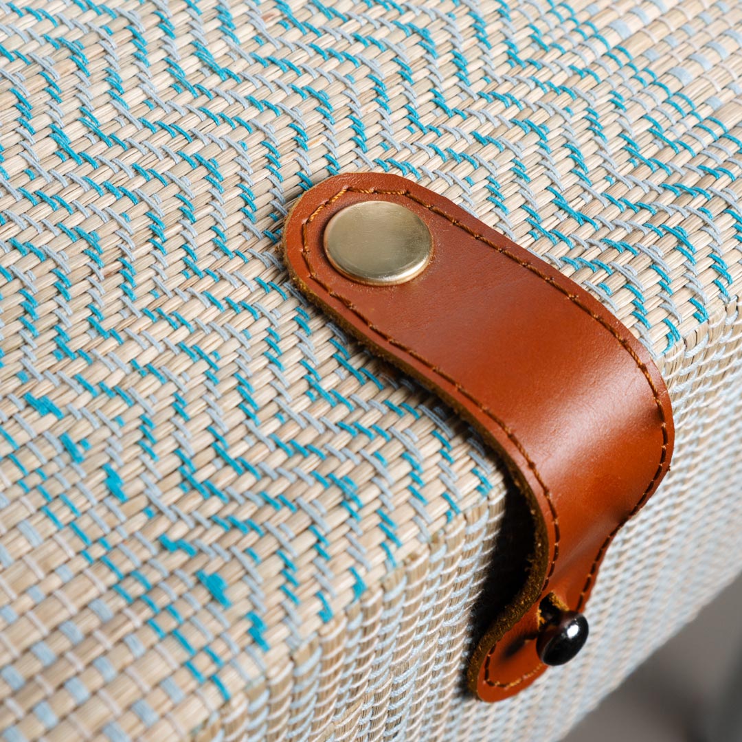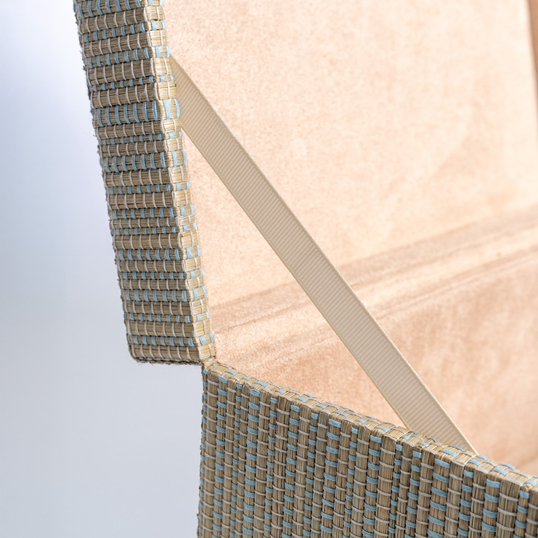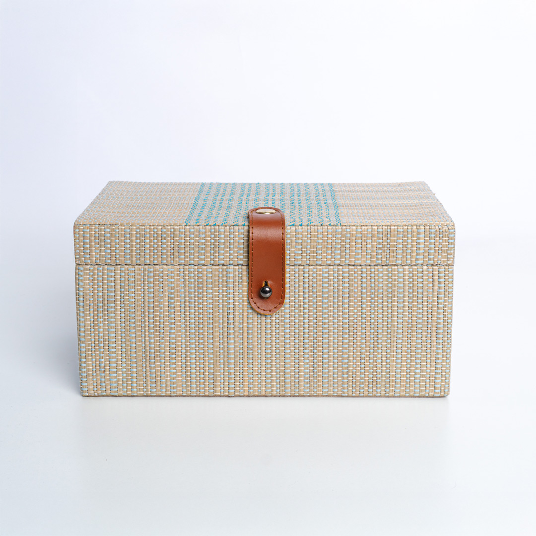 MDF-structured box fully wrapped in woven mendong, featuring an inner lining made of suede for a soft and luxurious feel. The top lid is supported by hinges and a ribbon tie on the left side, providing stability when opened and closed. The genuine leather handle adds a finishing touch that reinforces the premium impression and durability. Both functional and decorative, it's perfect for storing personal items, gift boxes, or high-end interior accessories.