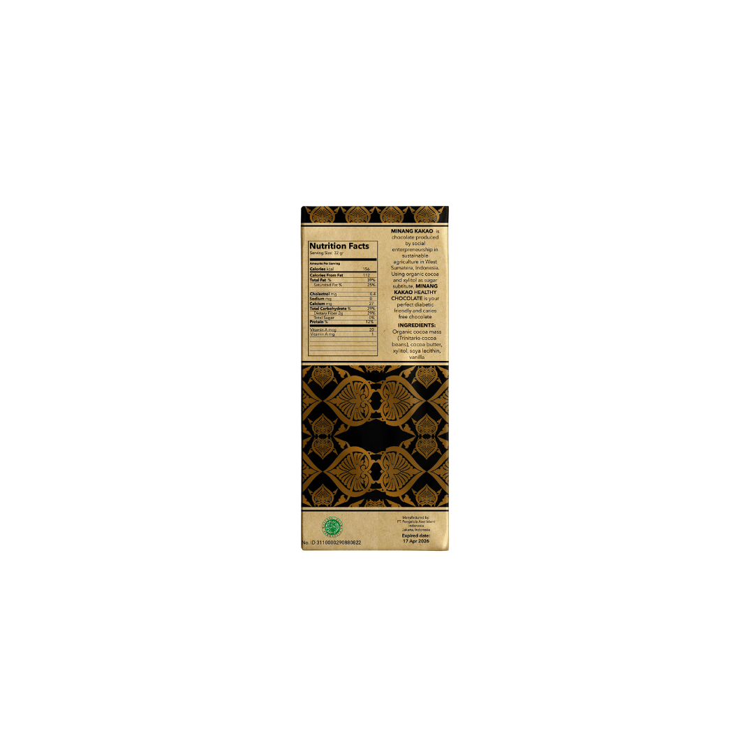 Organic Healthy Chocolate - Diabetic Friendly & Caries-Free Series The Organic Healthy Chocolate series is a premium chocolate bar (bean-to-bar) from Minang Kakao. It's specially made with sugar-free ingredients, retaining its rich chocolate flavor while remaining diabetic-friendly and caries-free. Made with all-natural ingredients, with no preservatives or chemical food additives, it's highly recommended for chocolate lovers. You'll experience an extraordinary dark chocolate sensation, as this product uses raw materials from well-fermented cocoa beans from Indonesia, the Minang Kabau region. Made with Swiss chocolate-making technology, Belgian flavor, and 100% Indonesian origin. It's the ultimate mood booster!