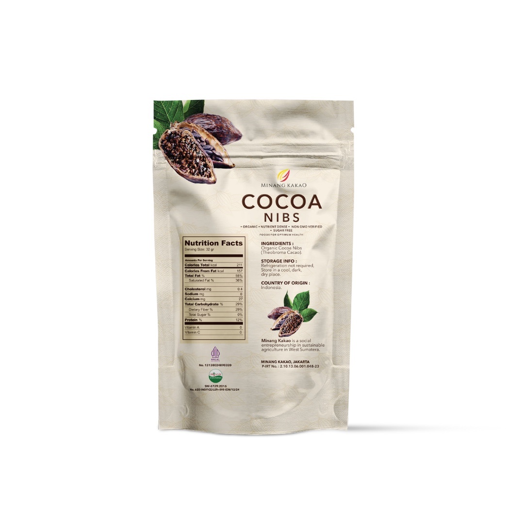 Cocoa Nibs - an organic superfood from Minang Kakao - is a modern super-healthy food made from 100% pure cocoa beans that have been roasted at 130 degrees Celsius (which ensures the beans are free from all bacteria and germs that may have been introduced during the plantation process), and then carefully cracked and the seed coats removed. The health benefits of cocoa beans have been understood thousands of years ago by the Aztecs. They called it yollotl eztli, meaning "heart blood." However, in 2009, this claim received scientific support. Cocoa consumption is linked to a reduced risk of coronary heart disease and stroke (Medical Daily). Cocoa nibs contain 40 times more antioxidants than blueberries. Antioxidants derived from flavonoids have been shown to increase HDL, the good cholesterol, in the blood. Furthermore, cocoa beans are a good source of iron for the blood. Furthermore, this food of the gods contains phenylethylamine (PEA), which is beneficial for improving mood and energy. This occurs by increasing the stimulation of serotonin, dopamine, and anandamide production in the body. Cocoa nibs can be eaten directly as a snack or mixed into other foods such as chocolate, yogurt, milk, cereal, oatmeal, and more. They are highly recommended for people with and to prevent diabetes, heart disease, cancer, and stroke