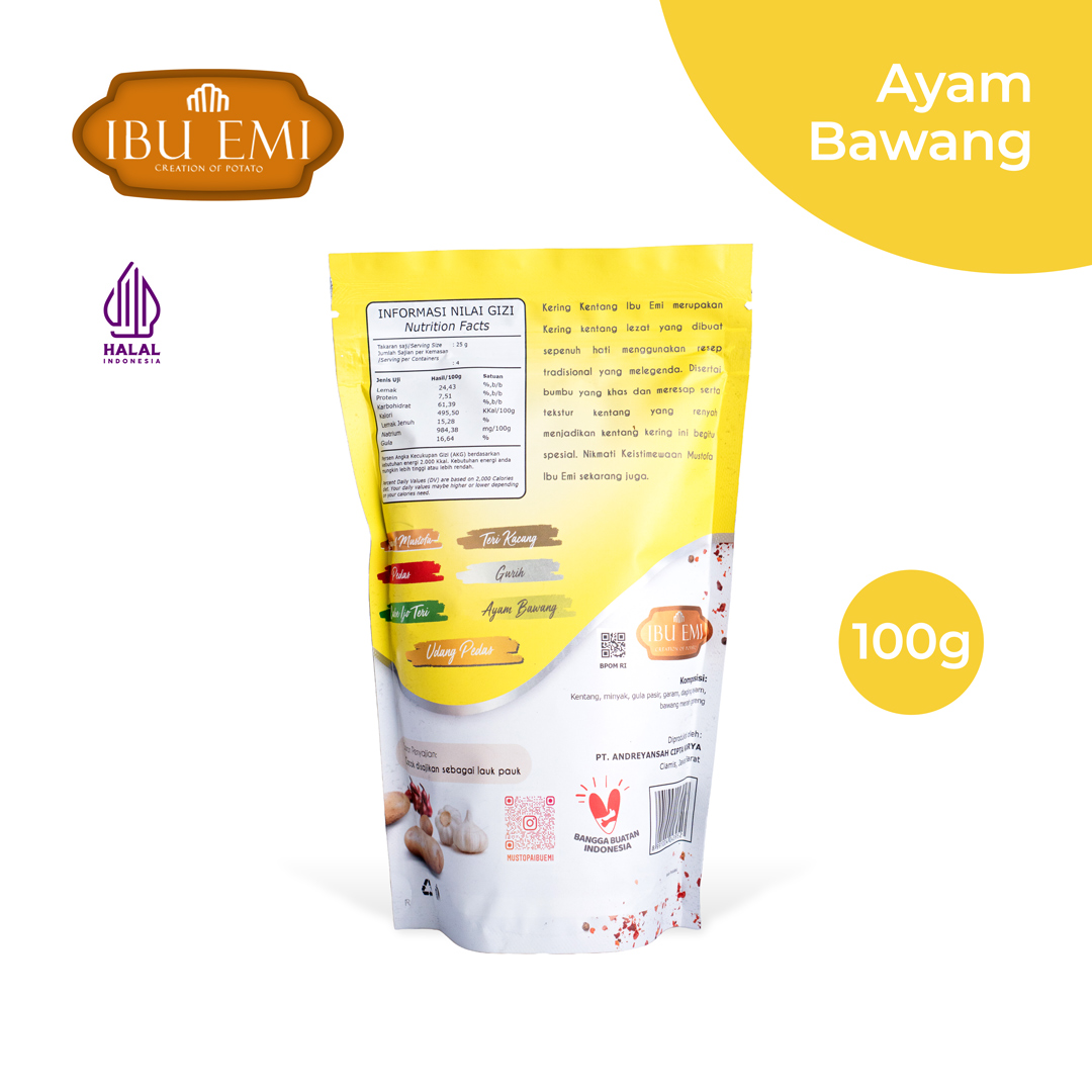 Mustofa Ibu Emi is the flagship brand of PT. Andreyansah Cipta Karya, operating in the food industry. It was founded in 2014 by Emi Sopyanti, a housewife with a passion for cooking. Seeing a market opportunity, Mrs. Emi began producing and marketing kentang mustofa (crispy spiced potato sticks) through social media. Using selected potatoes, natural spices (without artificial flavor enhancers), a hygienic process, long-lasting crisp texture, and protein toppings such as real chicken, shrimp, and anchovies, the brand offers a unique, healthy, and innovative snack for both local and online markets. Positive responses motivated Mrs. Emi to grow Mustofa Ibu Emi with a mission to deliver high-quality and innovative products.