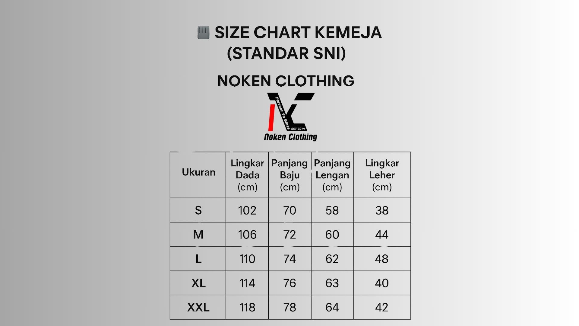 Size: | Ukuran | Lebar Dada (cm) | Lingkar Leher (cm) | Panjang Baju (cm) | Panjang Lengan (cm) | Lebar Bahu (cm) | | ------ | --------------- | ------------------ | ----------------- | ------------------- | --------------- | | S | 48–50 | 37–38 | 68–70 | 58–60 | 42–44 | | M | 51–53 | 39–40 | 71–73 | 61–63 | 45–46 | | L | 54–56 | 41–42 | 74–76 | 64–65 | 47–48 | | XL | 57–59 | 43–44 | 77–79 | 66–67 | 49–50 | | XXL | 60–62 | 45–46 | 80–82 | 68–69 | 51–52 |