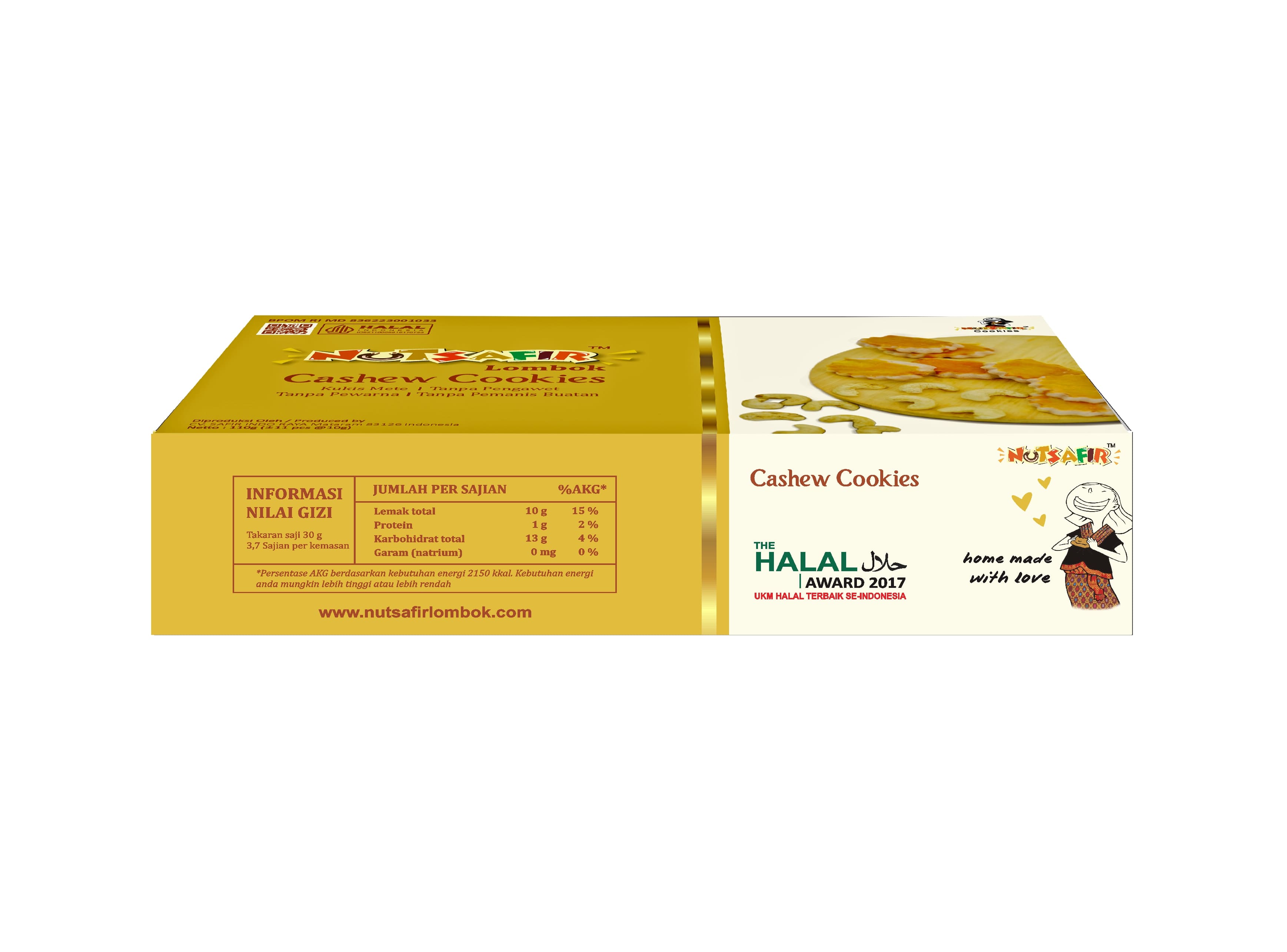 Made from selected cashew seeds from East Lombok, North Lombok, and Sumbawa which are processed hygienically, without preservatives, without artificial sweeteners, and without coloring. Cashew seeds have nutritional content including; high enough calories, and contain carbohydrates, protein, fat, and fiber. Cashew nuts also contain vitamin K, vitamin E, folate, and B vitamins, calcium, sodium, potassium, magnesium, phosphorus, zinc, and iron. Enjoy the crunchy sensation of cashews until the last bite. Price: Rp. 30.000,- Netto: 110 Ingredients : Wheat Flour, Palm Oil, Sugar, Cashew, Skim Milk Powder, Edam Cheese, Margarine, Baking Powder, Salt, Vanilla.