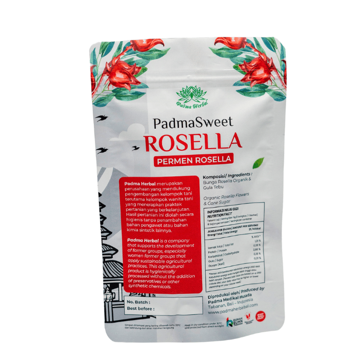 Padma Rosella Candy is a natural herbal candy made from high-quality rosella flower petals organically grown by local farmers in Tabanan, Bali. It is processed hygienically to ensure all its natural benefits are preserved. Padma Rosella Candy is a snack that is not only delicious but also healthy.