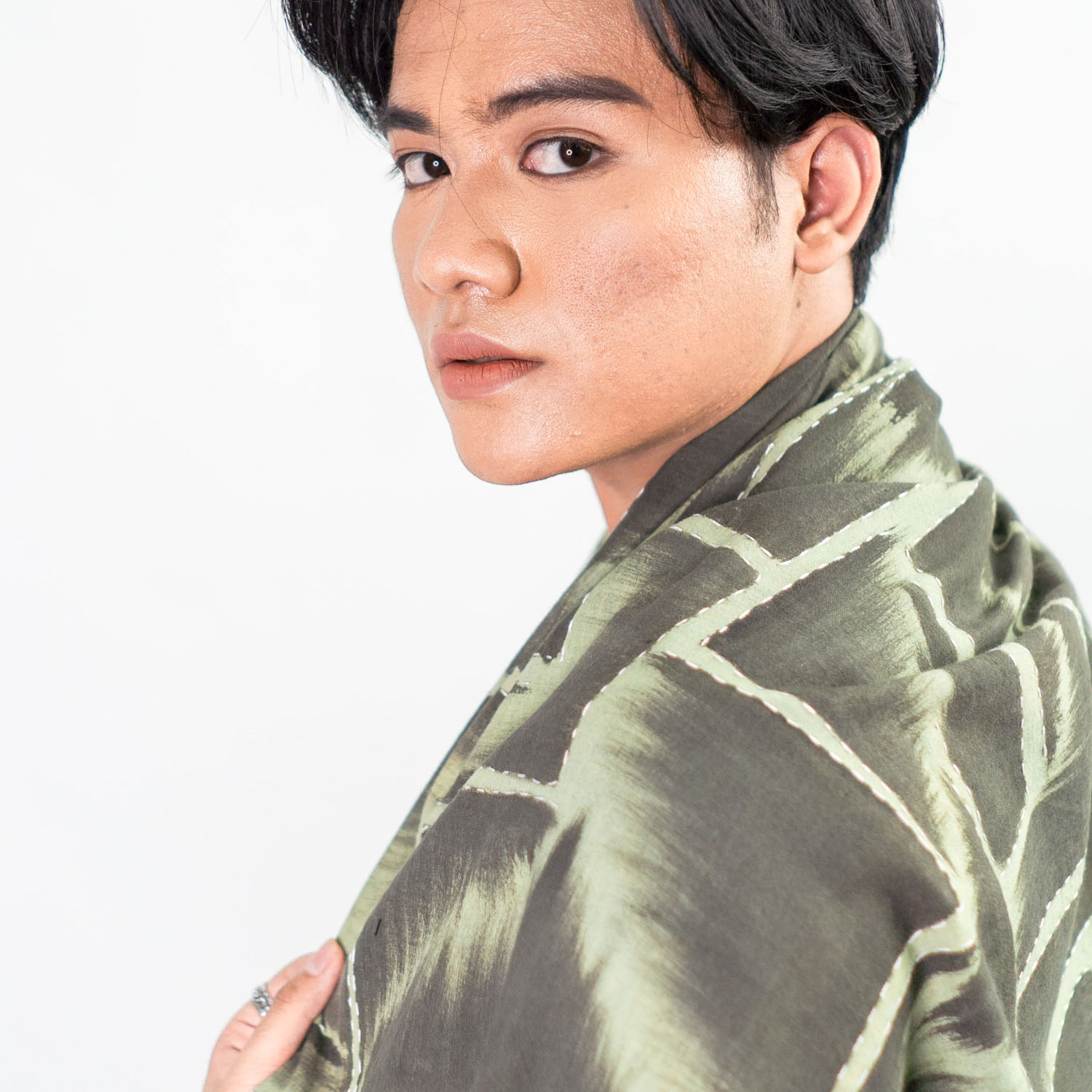 Pattern Meaning: Painted scarf ini dibuat dengan teknik lukis menggunakan tinta warna alam, dan motifnya terinspirasi dari Bedeg atau anyaman bambu yang biasa digunakan untuk dinding rumah orang Bali.