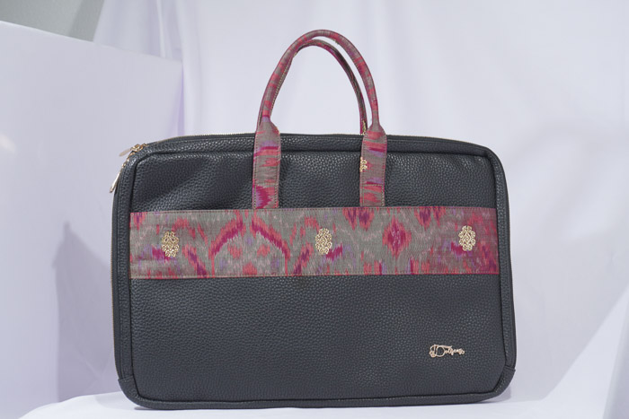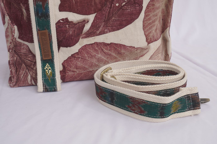 A handbag with a fairly large size, made from canvas with a teak leaf motif and Palembang textile accents, namely woven blanks on the handle, make this bag very unique and beautiful