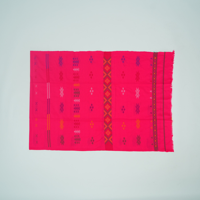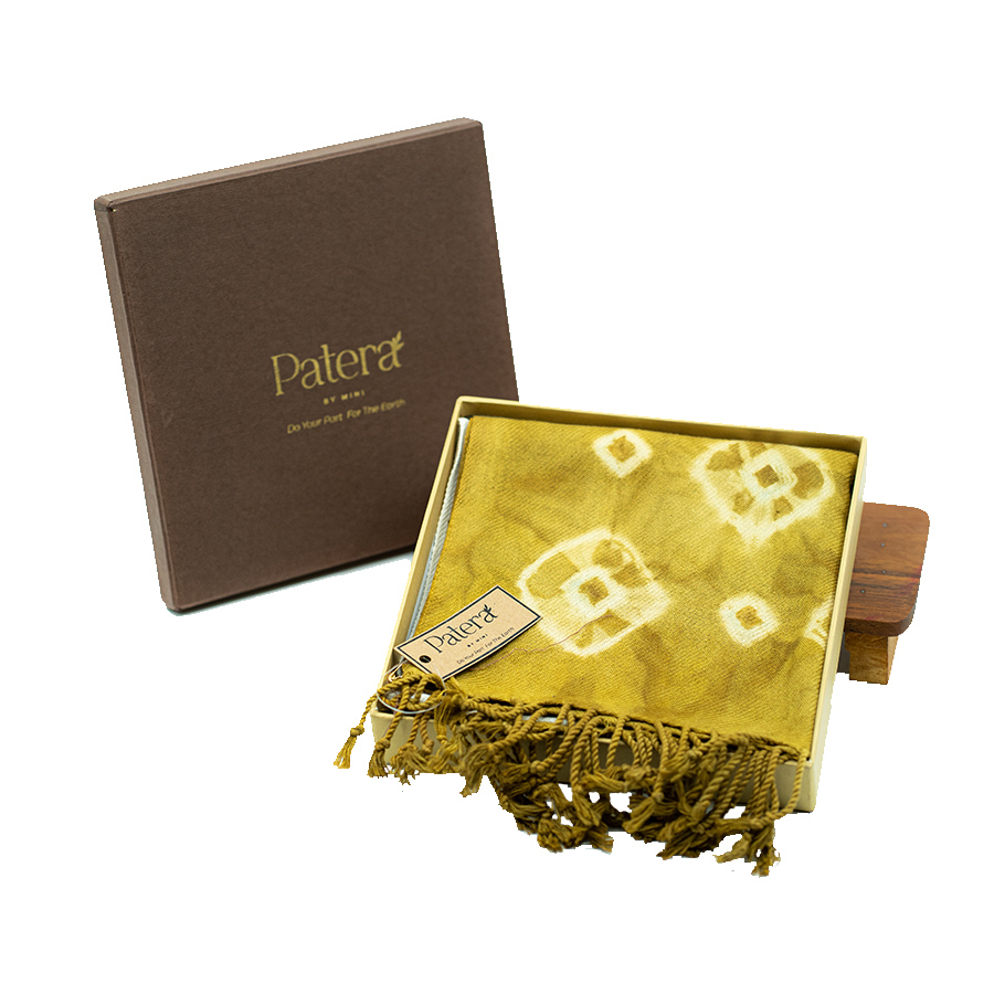 Pattern Meaning: Syal ini di buat dengan alat tenun bukan mesin dan di motif dengan kolaborasi 2 tehnik yaitu tie die yang biasanya di Palembang di kenal dengan jumputan dan juga ecoprint dengan daun dan rumput di lingkungan sekitar. Tie dye di celup dengan pewarna alam kayu Tegeran sehingga semua prosesnya sangat ramah lingkungan.