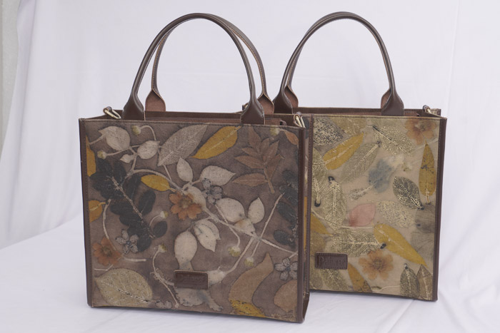 Large size handbag, made from denim patterned with ecoprint technique using surrounding leaves and natural dyes, making this bag very limited and special