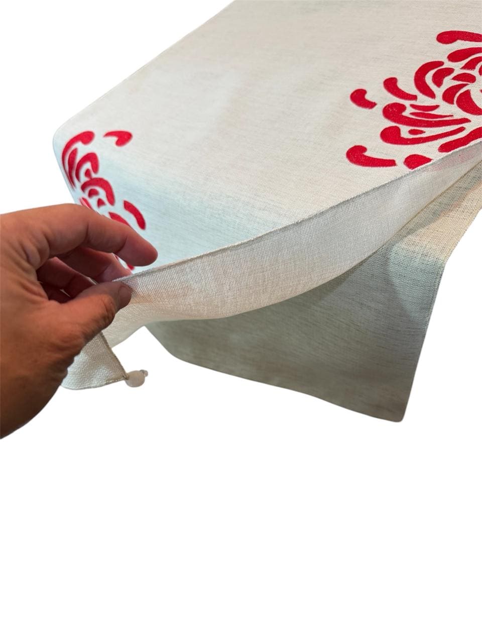 Add a touch of elegance and charm to your table setting with this “In Love Chrysanthemum” embroidered table runner. Featuring striking red chrysanthemum floral embroidery, this piece is crafted from durable linen polyester for a light yet long-lasting decor accent.