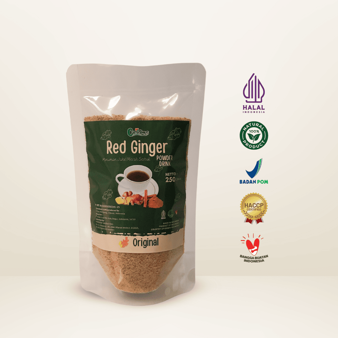 Cardimus Original Red Ginger Powder is a natural herbal drink made from premium red ginger and palm sugar, with no added flavors or spices—just pure, authentic warmth. Perfect for those who love the strong, classic taste of red ginger. Packed in a practical 250g pouch, simply mix 2–3 spoonfuls with warm water for a soothing and energizing drink.