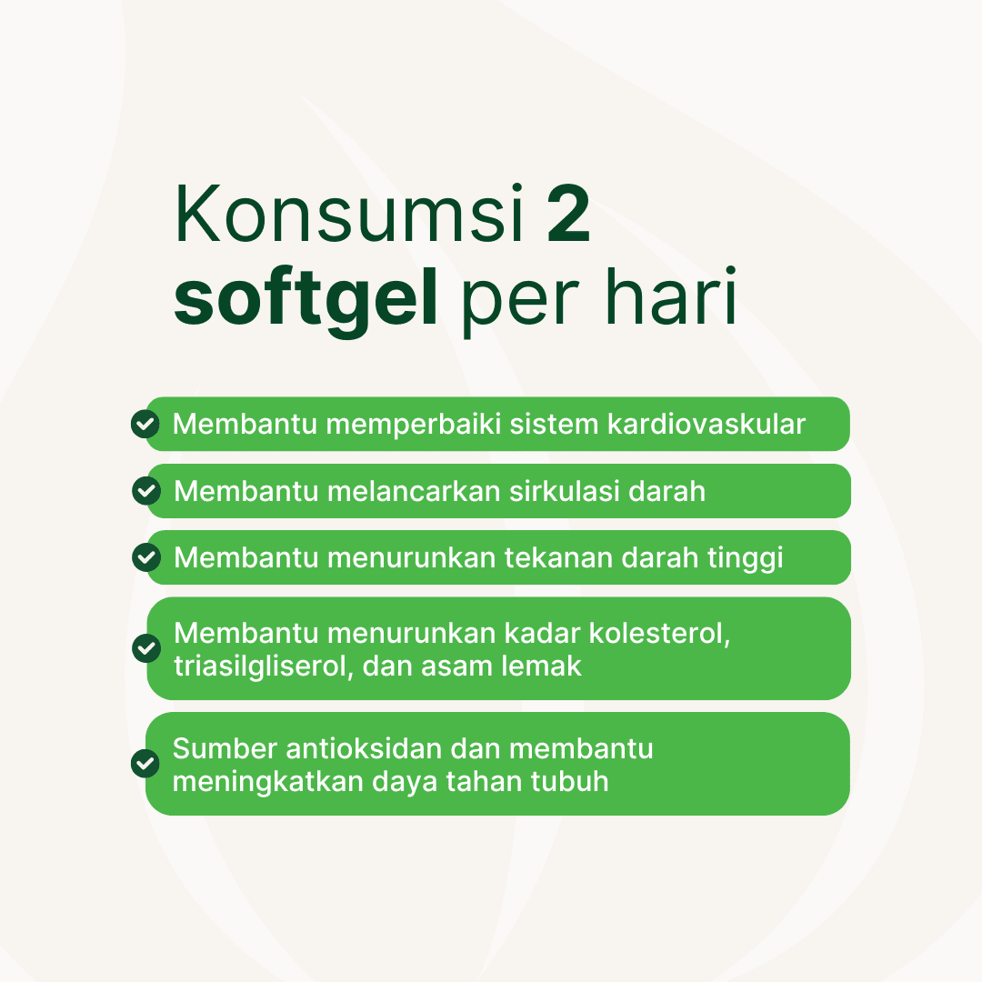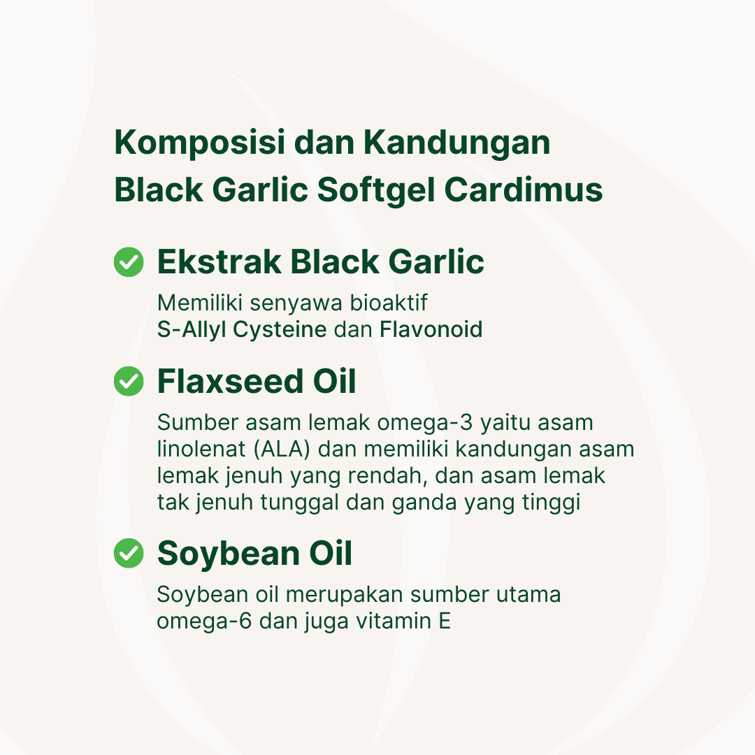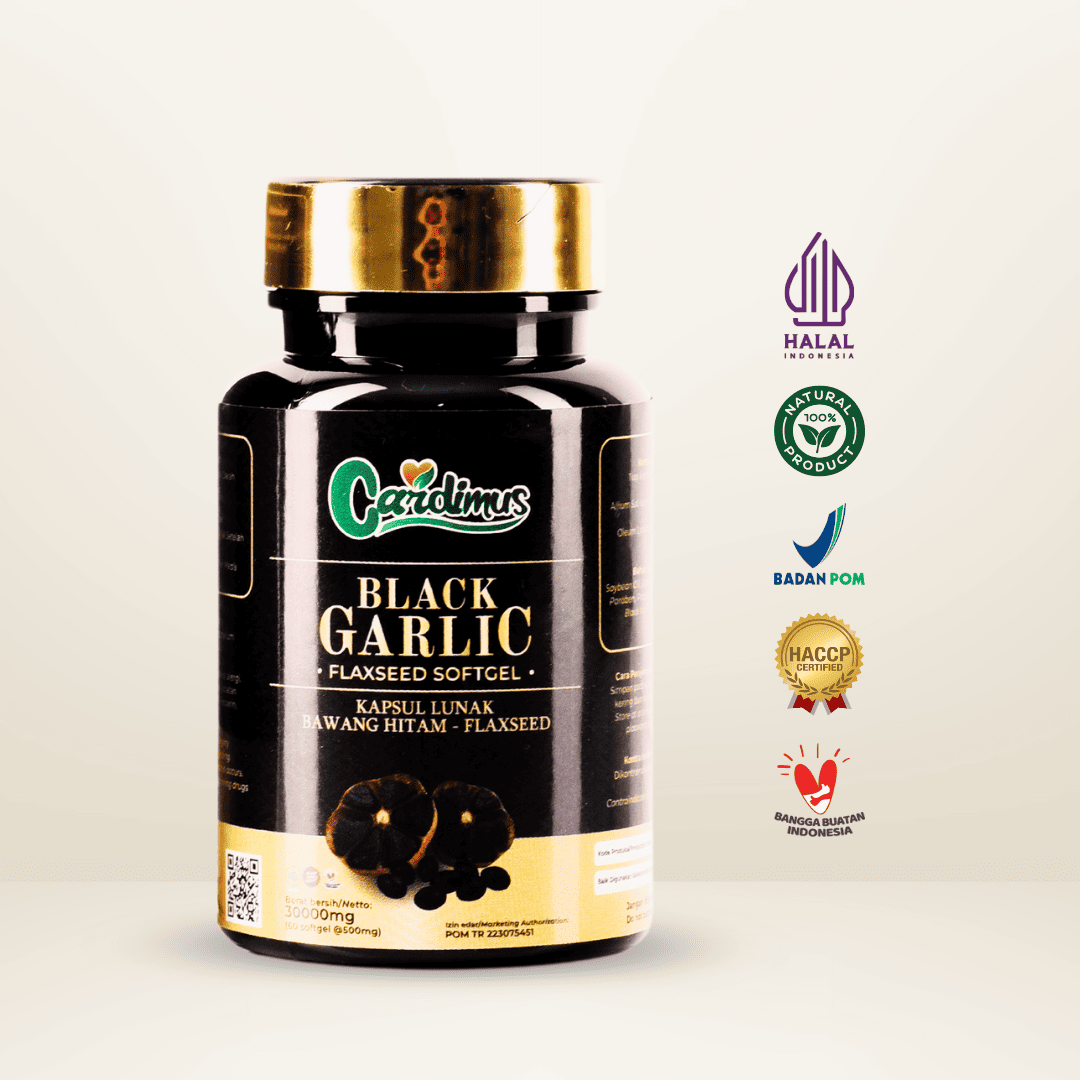 CARDIMUS BLACK GARLIC SOFT GEL is a derivative product of black garlic in the form of black garlic extract combined with flaxseed oil and soybean oil and used as a health supplement that functions to help maintain heart health and help treat cholesterol. Flaxseed oil helps to improve and maintain brain health and performance.