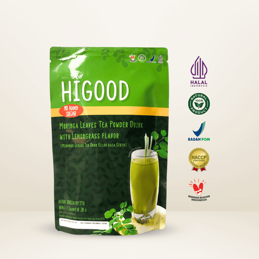 HIGOOD is a drink made from SUPERFOOD (Moringa) combined with lemongrass to produce a contemporary drink with a delicious and refreshing taste so that it can be enjoyed by all people in all weather. HIGOOD is a new way to consume SUPERFOOD (KELOR) which is rich in nutrients, practical and supports your healthy lifestyle. This variant is sugar free.
