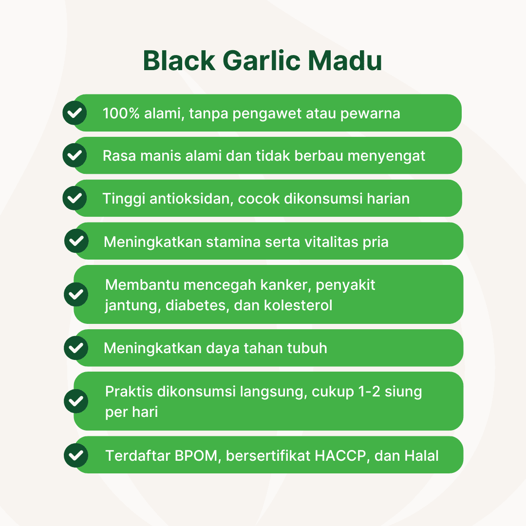 Black Garlic contains the compound S-allyl cysteine (SAC), flavonoid components, and amino acids that have the ability as antioxidant, anti-hypercholesterolemia, anti-hyperlipidemia, anti-inflammatory, anti-allergic, anti-diabetic, and also boosts heart health.