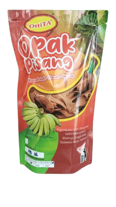 Banana Opak is a new innovation of banana processing through washing, boiling, peeling, grinding, printing, drying, frying, flavoring and packaging. Banana Opak is processed using modern technology, safe for consumption for all groups, Very thin texture, crispy and soft, salty, savory and spicy taste besides for snacks, very suitable as a side dish