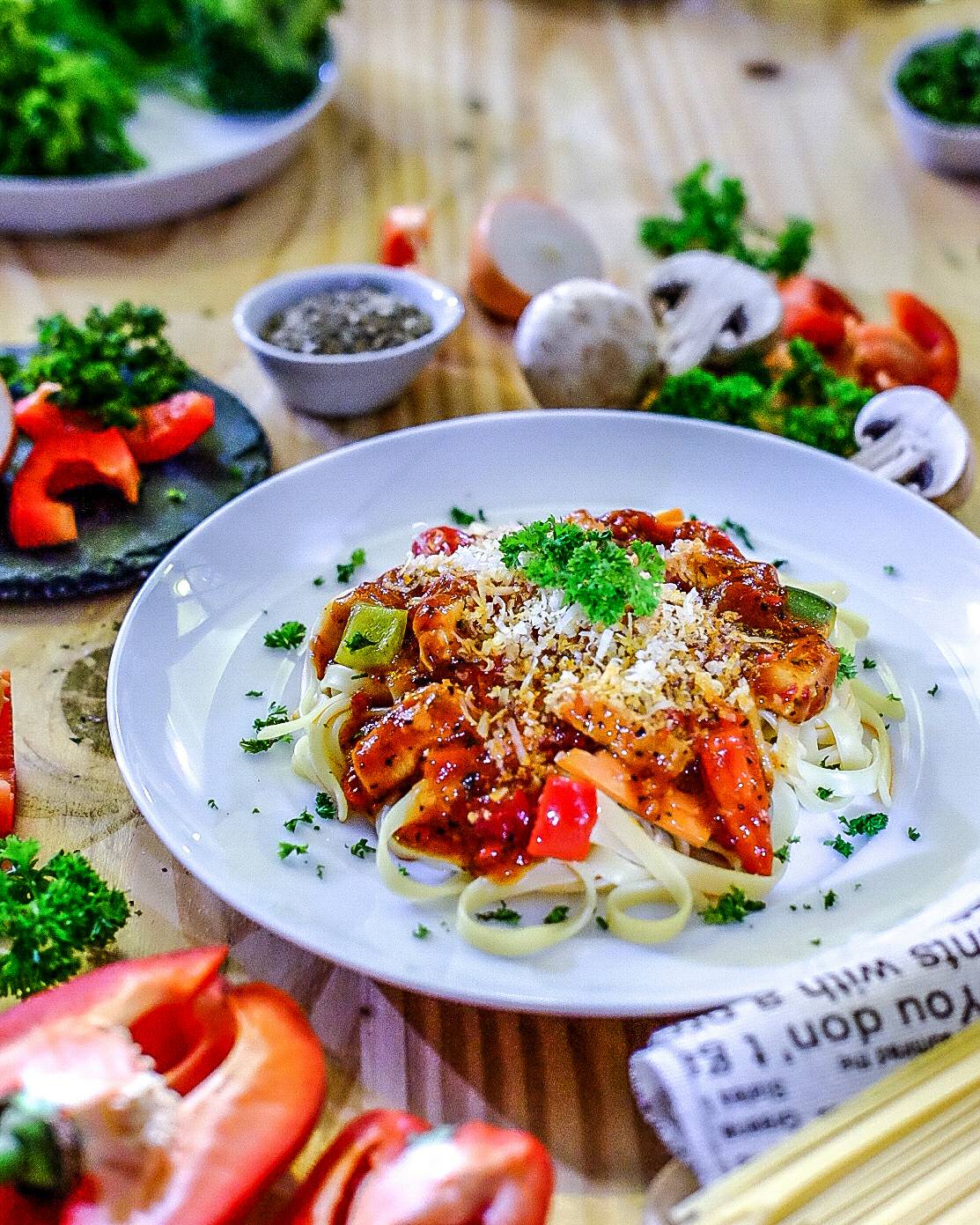 Material Content: Tomat, daging dada ayam cincang, pasta tomat, cabe rawit, bawang bombay, bawang putih, minyak canola, italian herbs, rempah-rempah.