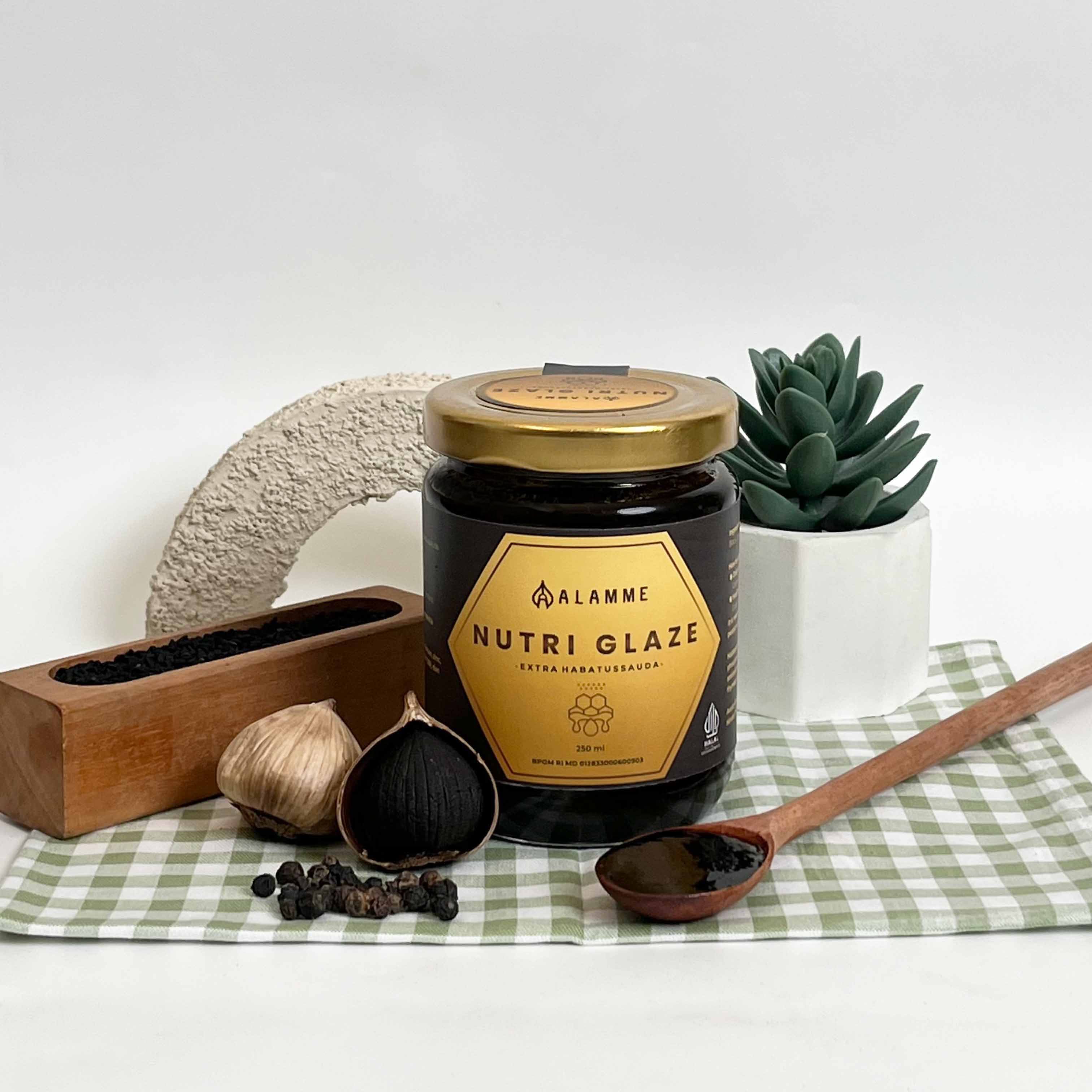 Nutri Glaze is a premium blend of black garlic, pure honey, black seed (Nigella sativa), and black pepper, formulated to deliver maximum health benefits. This superfood combination helps boost the immune system, support heart health, regulate blood sugar levels, and provide natural energy. With a smooth sweetness and a warm hint of spice, Nutri Glaze is a healthy and delicious choice for daily consumption.