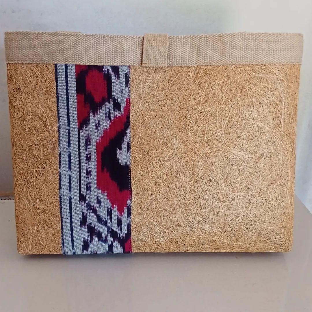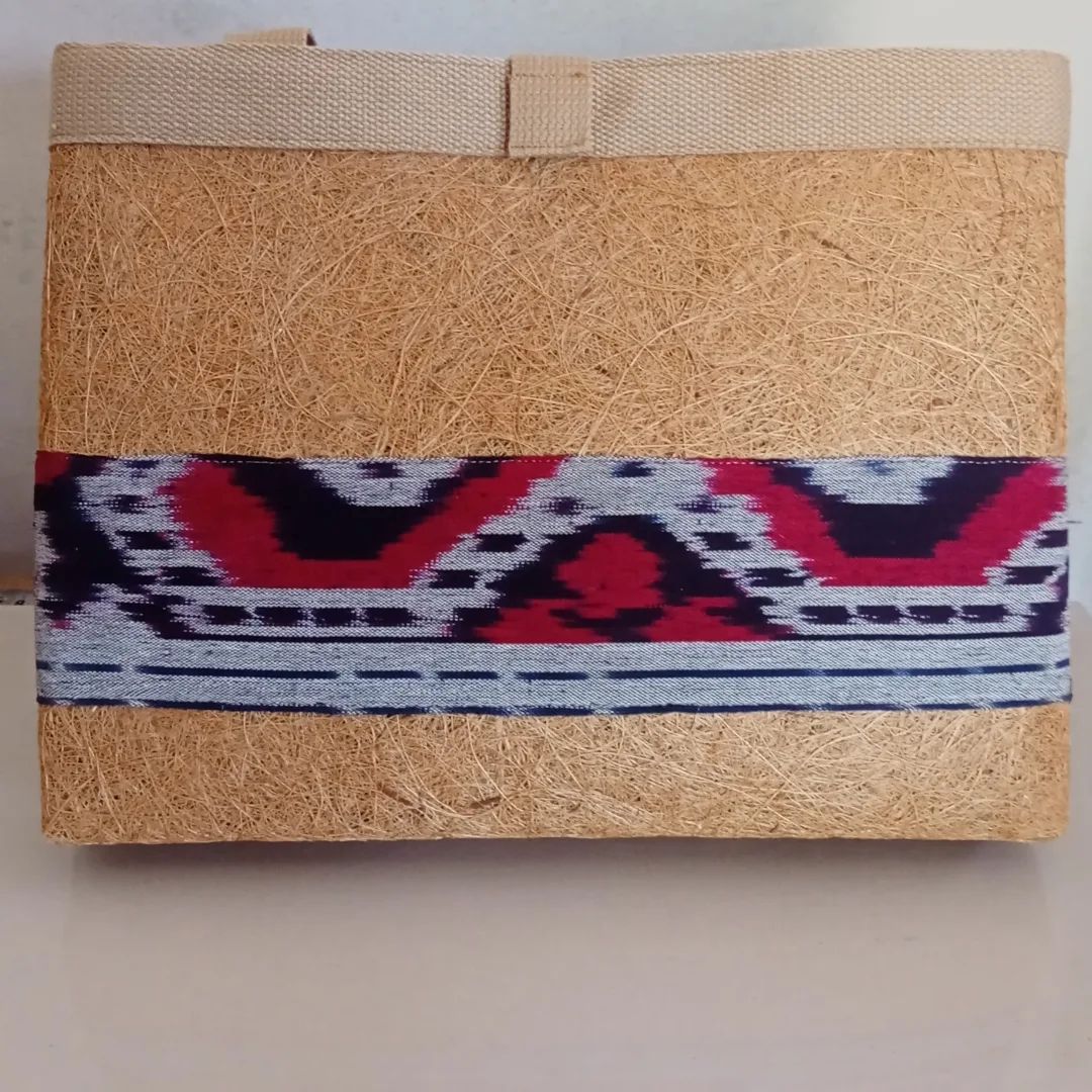 A unique and natural bag made from coconut husk with natural adhesive, utilizing fabric scraps from traditional woven textiles of North Sulawesi.