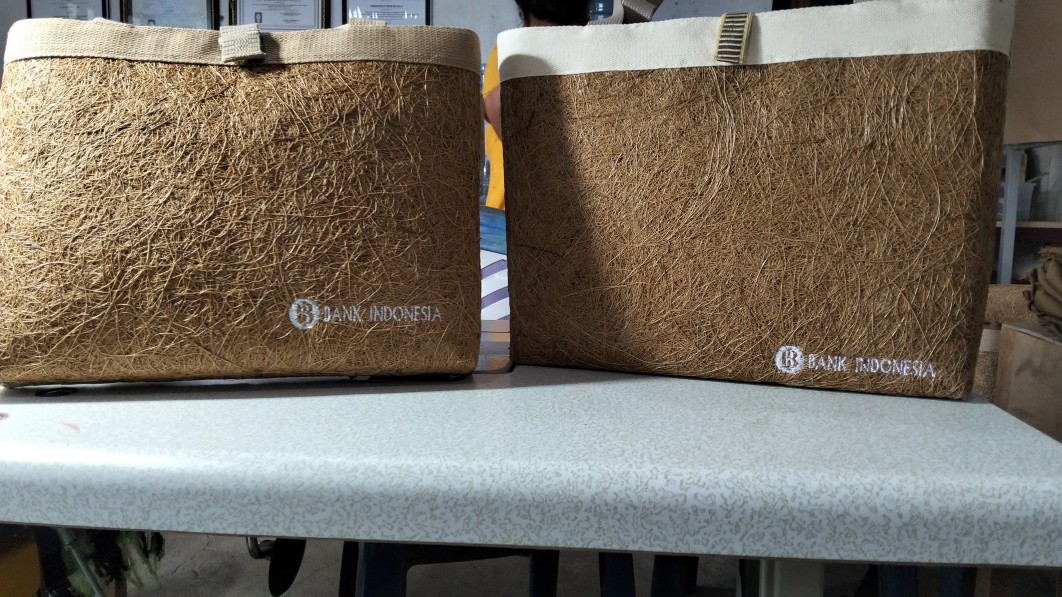 Material: Coconut husk, liquid latex, cotton webbing, magnetic button, fabric lining