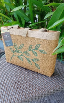 A unique and natural bag made from coconut husk with natural adhesive. Embroidered images and text are available upon request. Flower/leaf motifs made from coconut husk are also available.