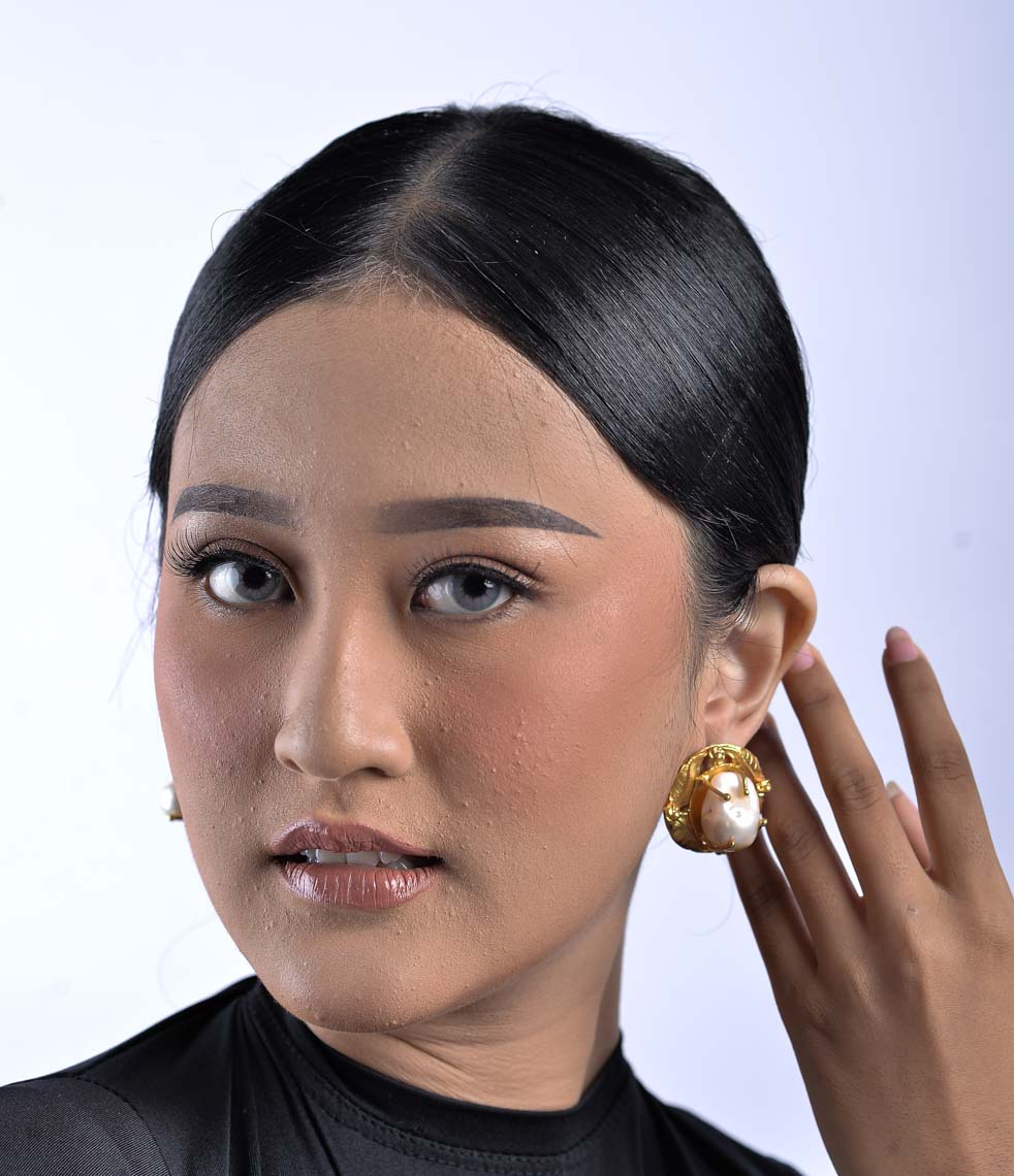 ANTING MAHARANI BULAT HAVE A ROUND SHAPE AND ARE SURROUNDED WITH JASMINE LEAVES MOTIVES, THE ADDITION OF BAROK PEARLS ADD A UNIQUE AND LUXURIOUS IMPRESSION