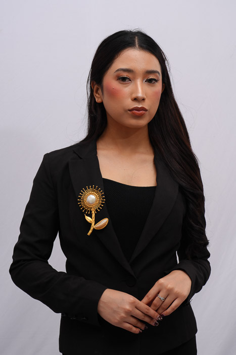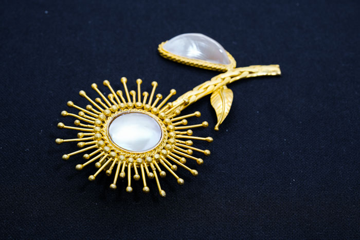 THIS BROOCH WAS INSPIRED BY THE SHAPE OF THE SUN COMBINED WITH A LEAF STALK MADE FROM MABE, WHILE AT THE TOP OF THIS BROSCH USES ARCU (SHELL)
