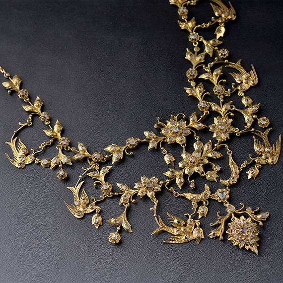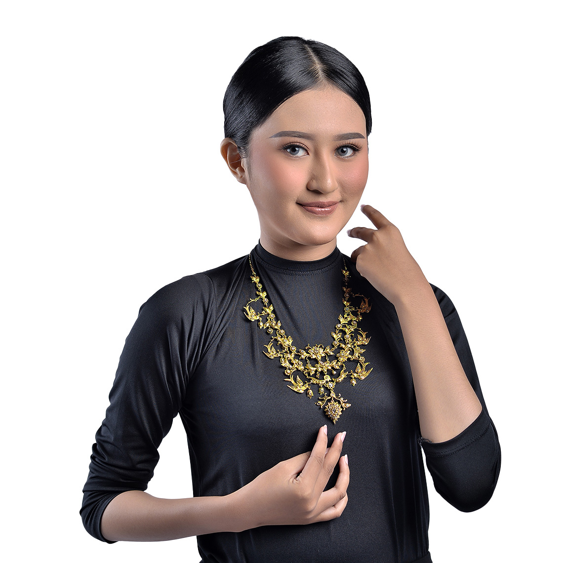 The Anak Ayam necklace is a gold-plated silver jewelry made from past handicrafts, the gems used are diamond gems. From the gem planting technique, we can see that this jewelry uses a handmade technique because it is installed one by one according to the size of the gem. This necklace is inspired by the motif of a chick.