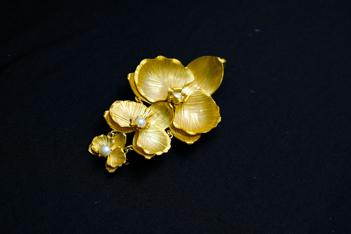 THIS BROOCH IS A BROSCH THAT WAS INSPIRED BY THE SHAPE OF AN ORCHID FLOWER ARRANGED IN 3 AND COMBINED WITH FRESHWATER PEARLS, THIS BROOCH CAN ALSO BE MADE INTO A PENDANT